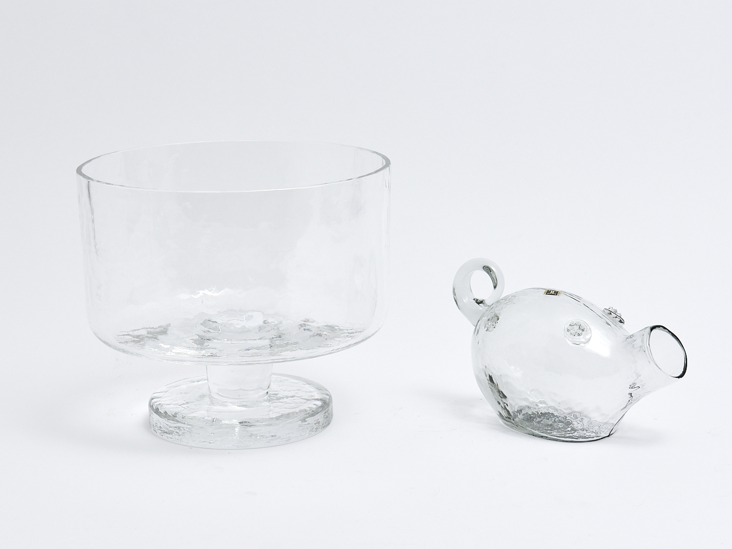 A SWEDISH RUSTICA 'PUKEBERG' GLASS STEMMED BOWL BY GORAN WARFF PLUS A NORWEGIAN 'HADELAND' NUT DISPENSER IN THE FORM OF A PIG H.16CM X DIA.15CM (LARGEST), LEONARD JOEL LOCAL DELIVERY: MEDIUM