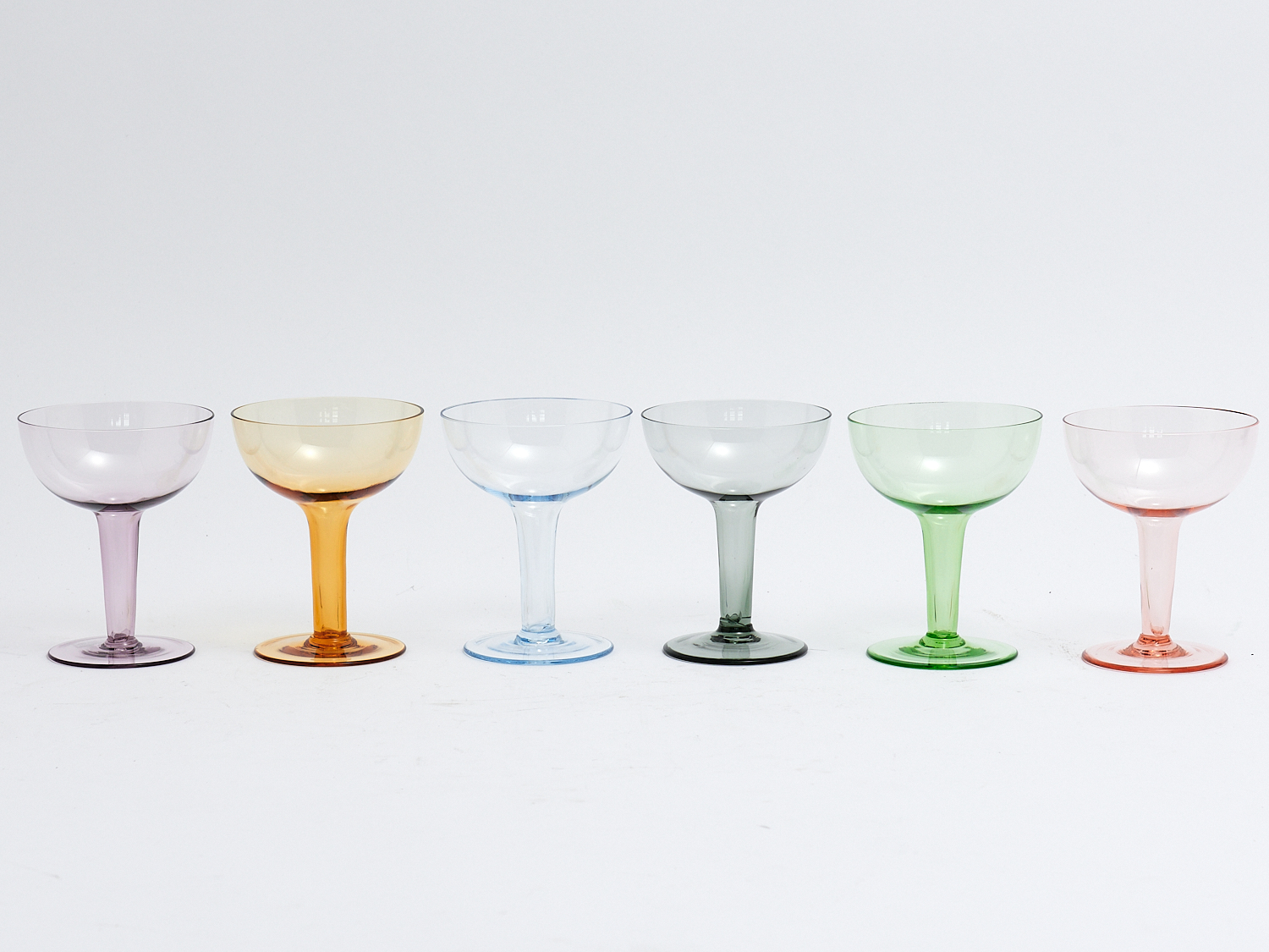 A SUITE OF SIX VINTAGE HARLEQUIN HOLLOW STEM CHAMPAGNE GLASSES H.11.5CM, LEONARD JOEL LOCAL DELIVERY: MEDIUM