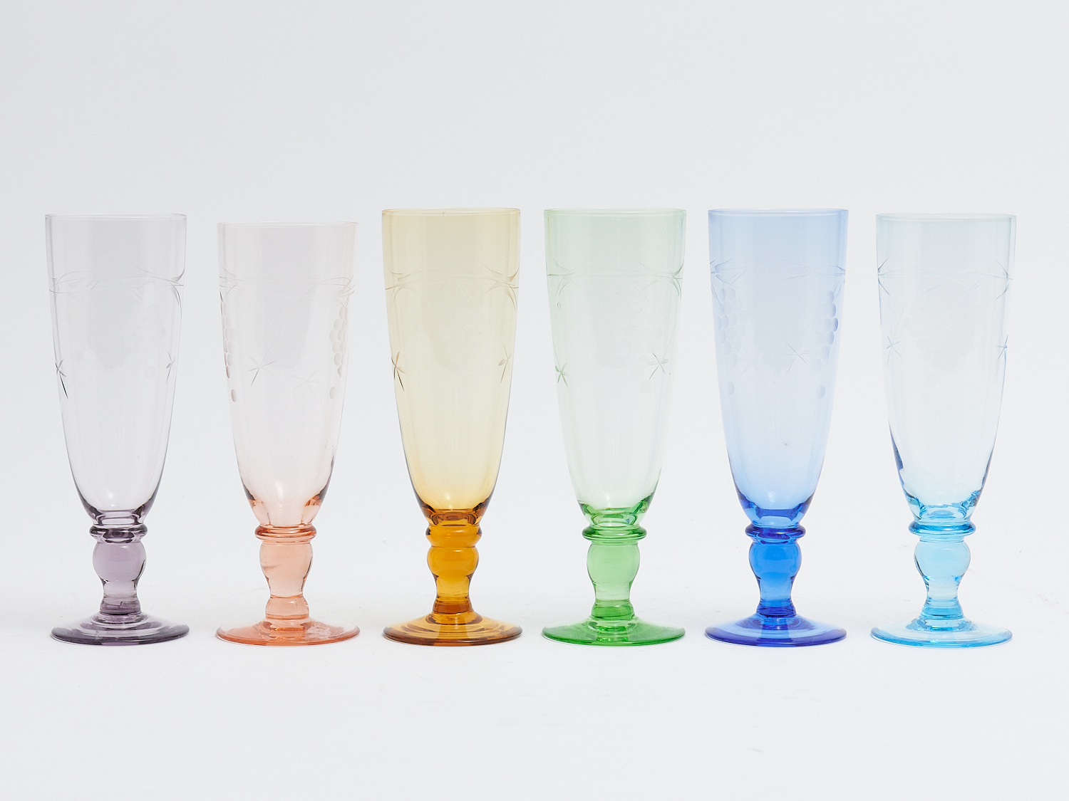 A SUITE OF SIX VINTAGE HARLEQUIN GLASSES WITH ETCHED GRAPE MOTIFS H.17.5CM, LEONARD JOEL LOCAL DELIVERY: MEDIUM