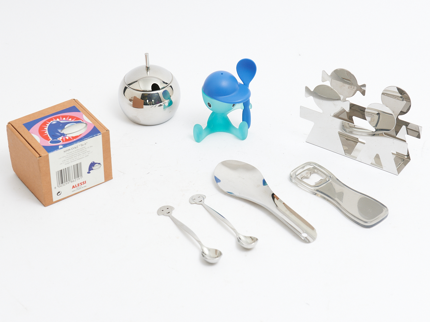 A COLLECTION OF EIGHT ALESSI ITEMS INCLUDING "SP09 DAZ TE O" TEA STRAINER BY STEPHANO PIROVANO H.12CM (TALLEST), LEONARD JOEL LOCAL DELIVERY: SMALL