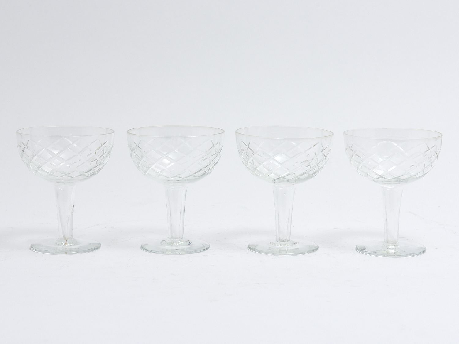 A SUITE OF FOUR VINTAGE CROSS-CUT CRYSTAL HOLLOW STEM CHAMPAGNE GLASSES H.11.5CM, LEONARD JOEL LOCAL DELIVERY: MEDIUM