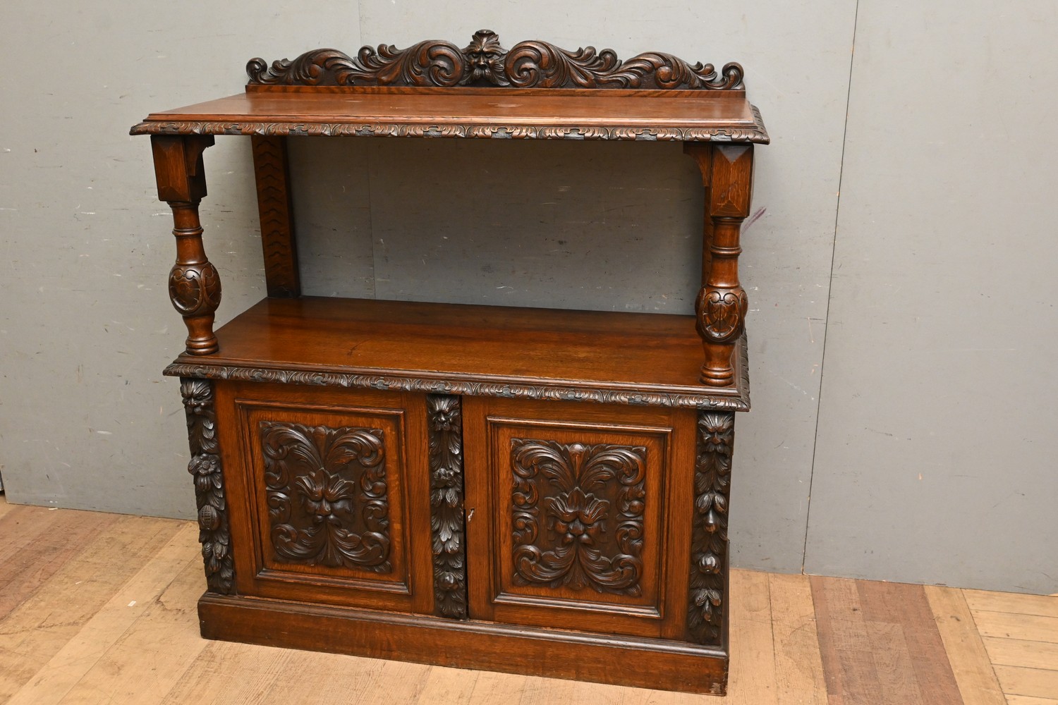 A LATE 19th CENTURY OAK OPEN SIDEBOARD (A/F) (H135 X W122 X D50 CM) (PLEASE NOTE THIS HEAVY ITEM MUST BE REMOVED BY CARRIERS AT THE CUSTOMER'S EXPENSE. LEONARD JOEL STAFF CANNOT ASSIST CARRYING THIS ITEM) (X-LARGE ITEM)