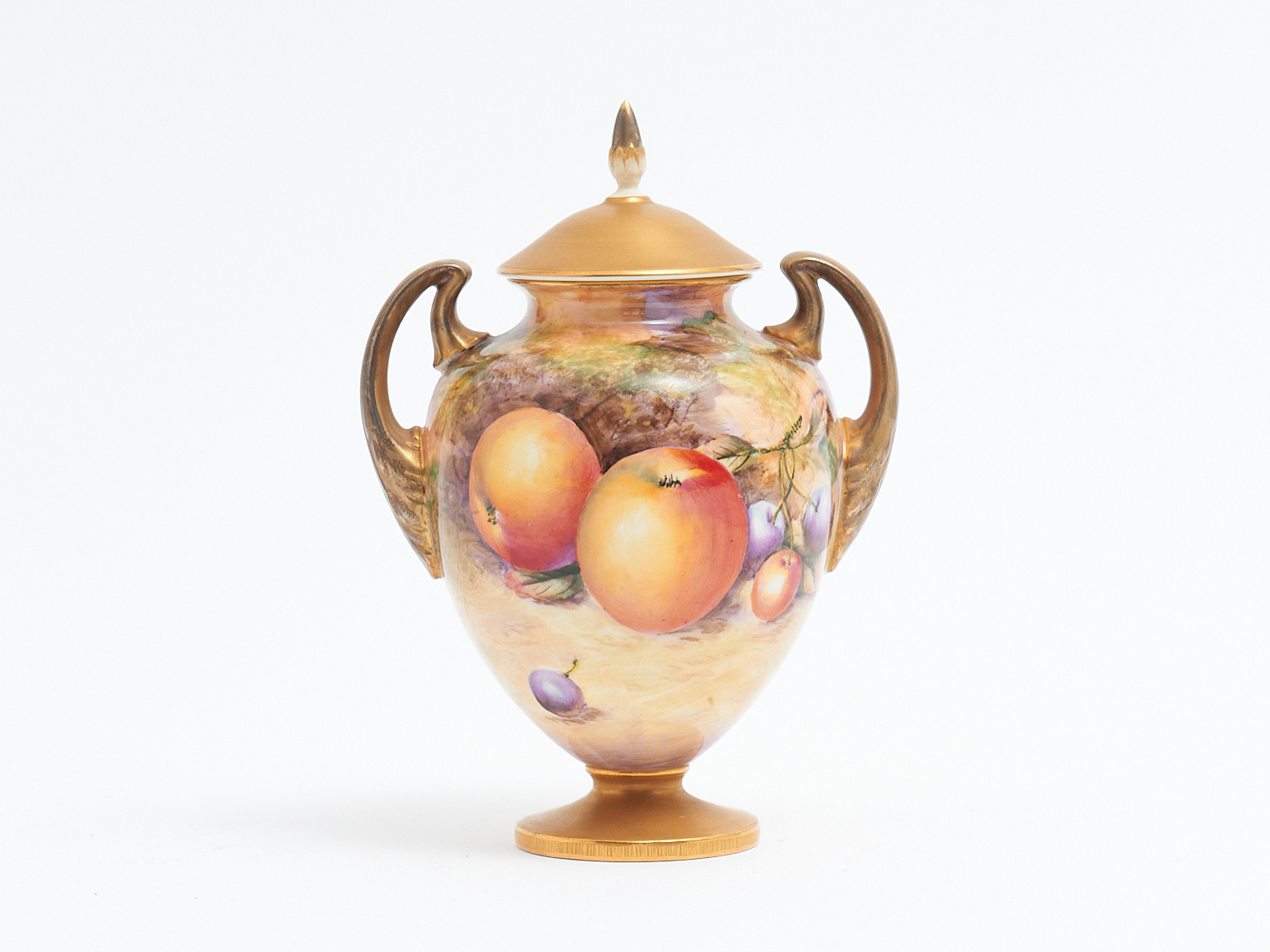 A ROYAL WORCESTER TWO-HANDLED COVERED VASE DECORATED BY RICHARD LEWIS, THIRD QUARTER 20TH C., H.17CM, LEONARD JOEL LOCAL DELIVERY: SMALL