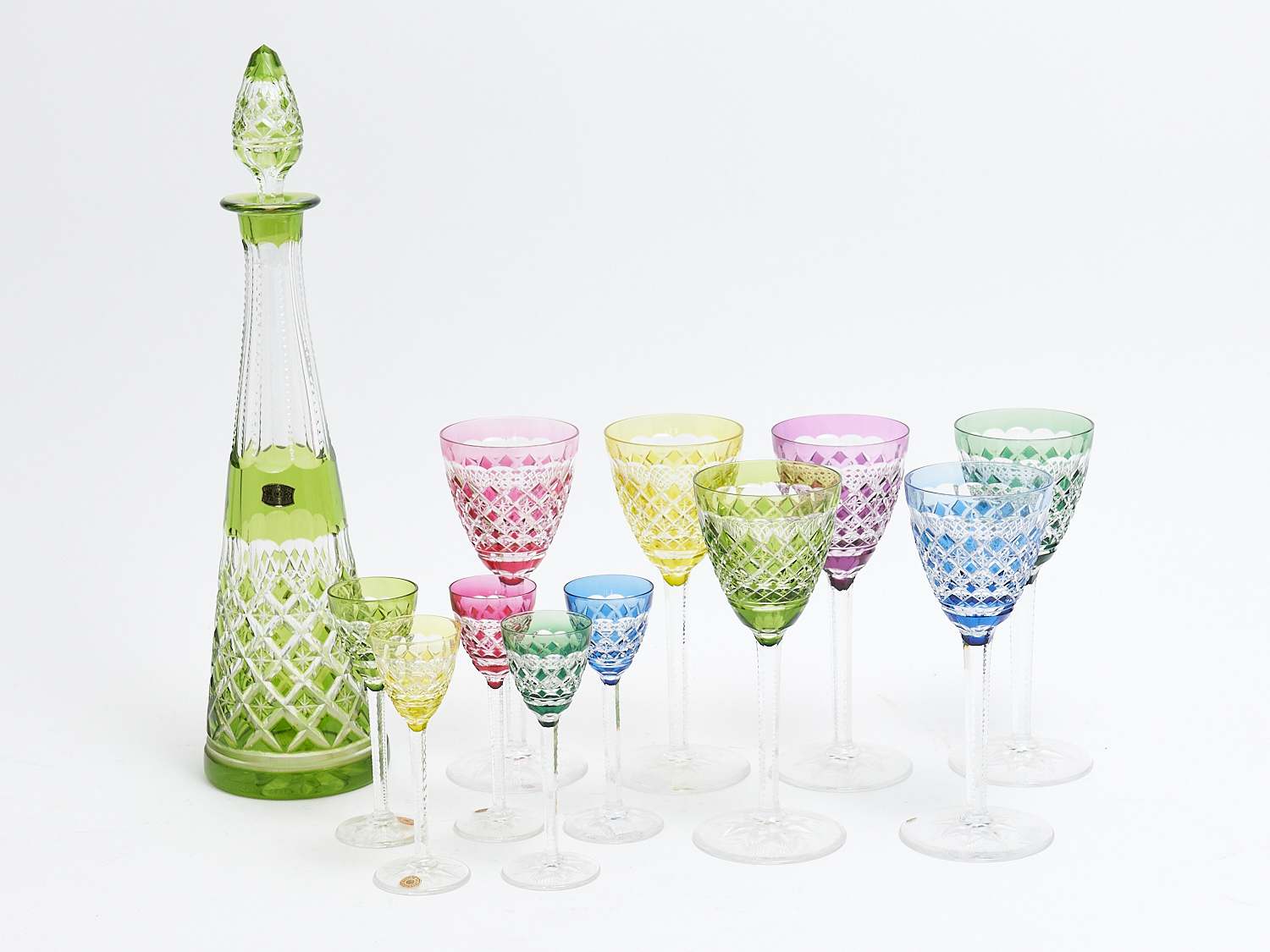 TWO HARLEQUIN SETS OF VAL ST LAMBERT STEMWARE TOGETHER WITH DECANTER H.40CM (TALLEST), LEONARD JOEL LOCAL DELIVERY: MEDIUM