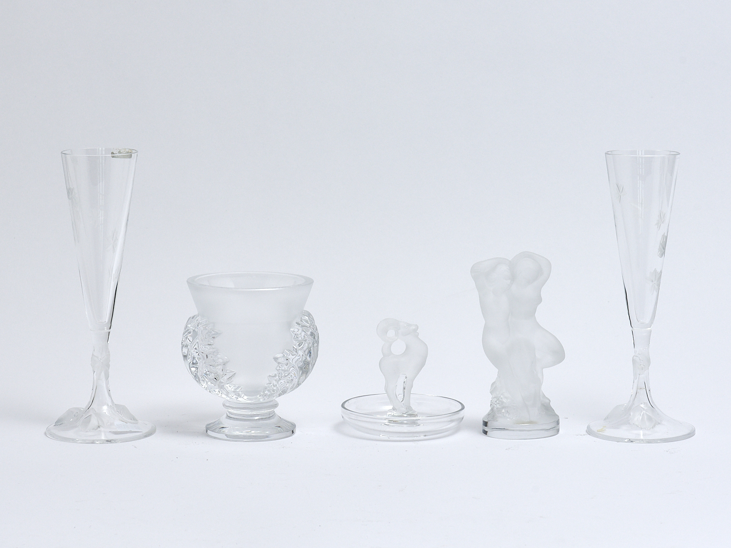 A GROUP OF LALIQUE CRYSTAL INCLUDING TOASTING GLASSES, VASE, RING DISH AND FIGURE H.21.5CM (TALLEST), LEONARD JOEL LOCAL DELIVERY: MEDIUM