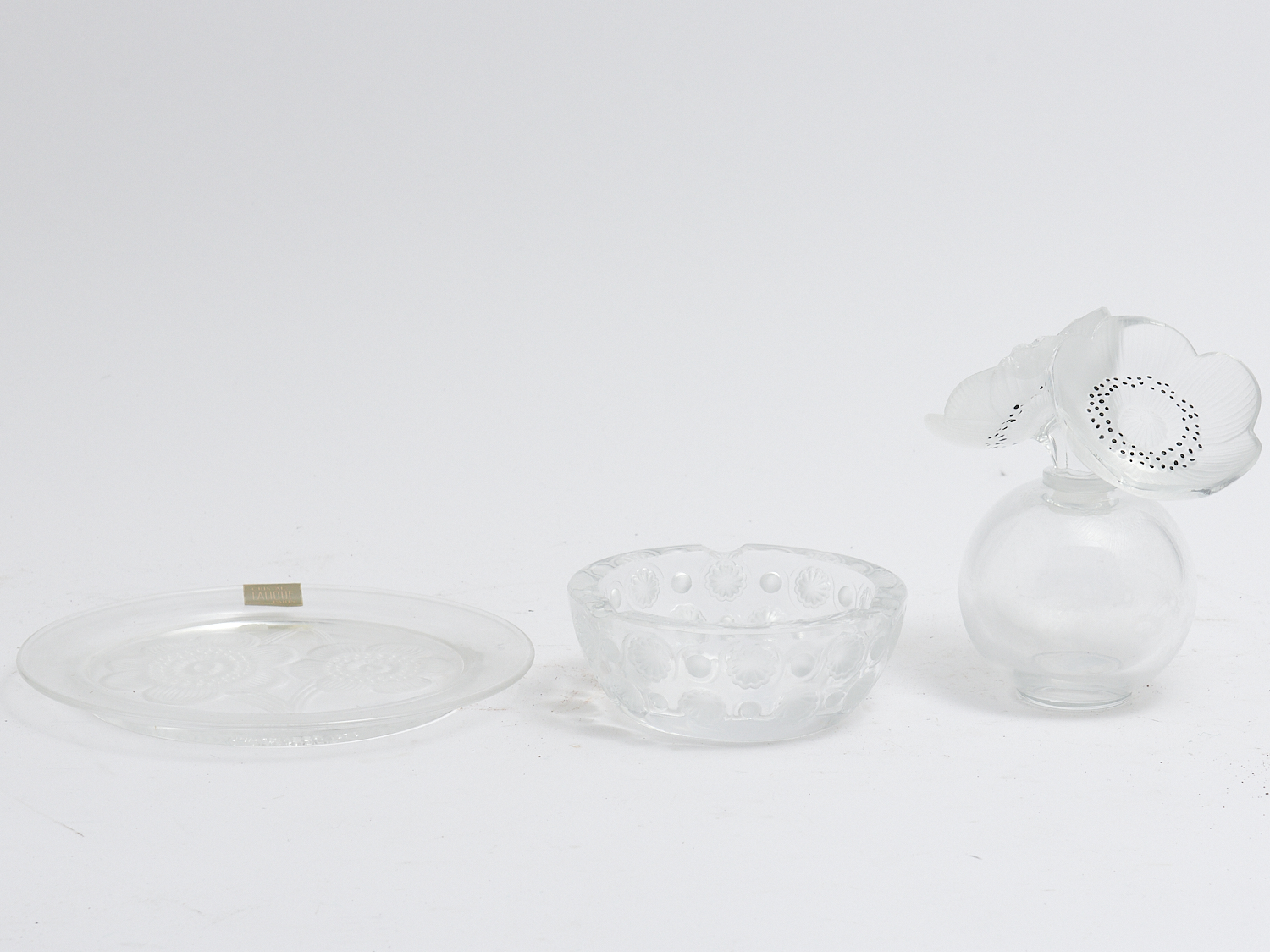 A GROUP OF LALIQUE INCLUDING YEAR PLATE, ASHTRAY AND PERFUME BOTTLE (A/F) DIA.21CM (LARGEST), LEONARD JOEL LOCAL DELIVERY: SMALL