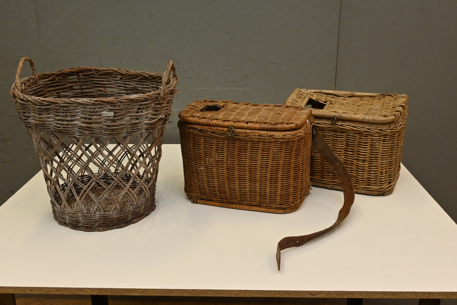 A GROUP OF THREE ANTIQUE 19TH-CENTURY CANE OBJECTS INCLUDING TWO FISHING CREOLES AND WOVEN FRUIT BASKET (A/F) (H40 X D40 CM) (LEONARD JOEL DELIVERY SIZE: LARGE)