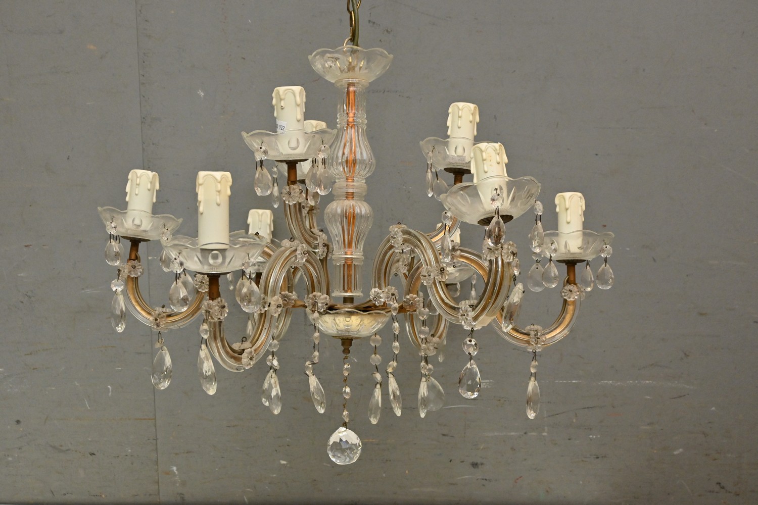 A SIX ARM GLASS AND CRYSTAL CHANDELIER (A/F) (95H X 65 DIAMETER ) (LEONARD JOEL DELIVERY SIZE: LARGE)