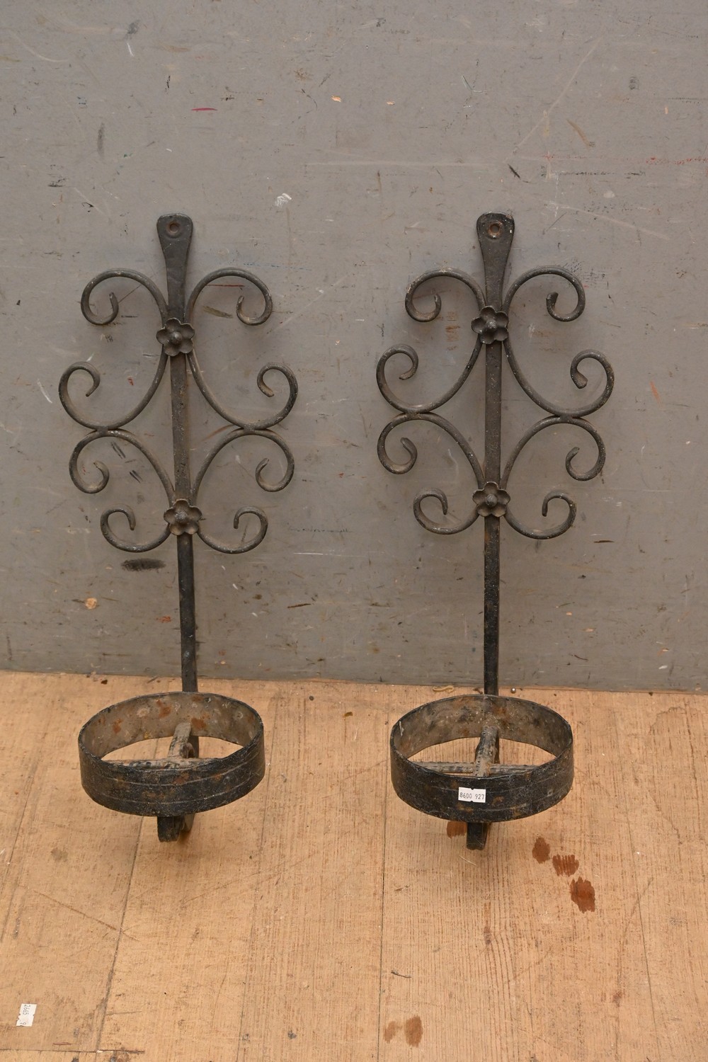 A PAIR OF WROUGHT IRON WALL APPLIQUE POT PLANT HOLDERS (H53 X W21 X D21 CM) (LEONARD JOEL DELIVERY SIZE: MEDIUM)