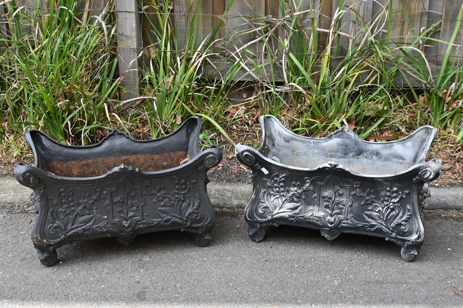 A PAIR OF ANTIQUE 19TH CENTURY FRENCH CAST-IRON PLANTER POTS (A/F) (H32 X W54 X D33 CM) (LEONARD JOEL DELIVERY SIZE: X-LARGE)