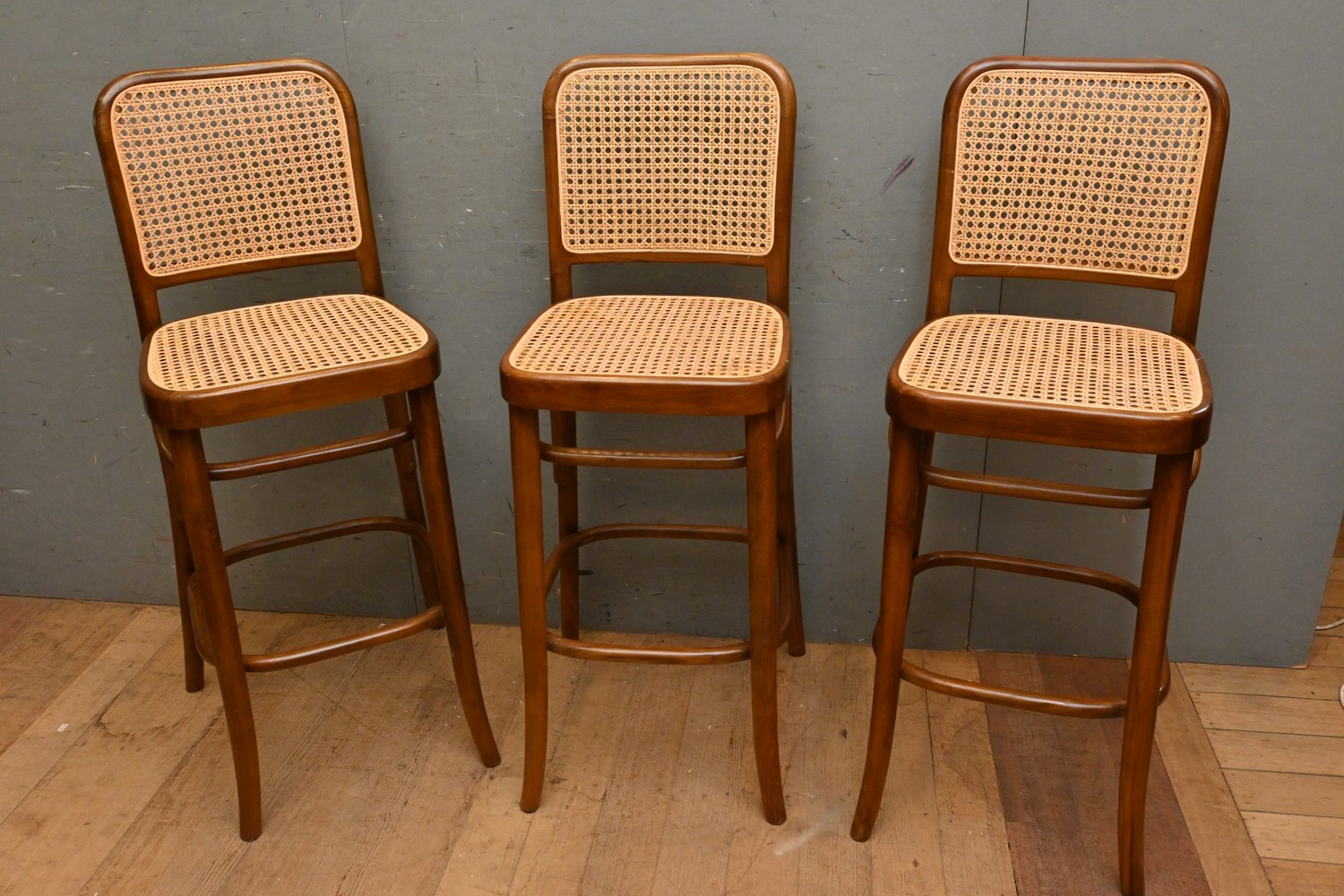 A SET OF THREE HOFFMAN STYLE BARSTOOLS (A/F) (112H X 42W X 52D CM) (LEONARD JOEL DELIVERY SIZE: X-LARGE)
