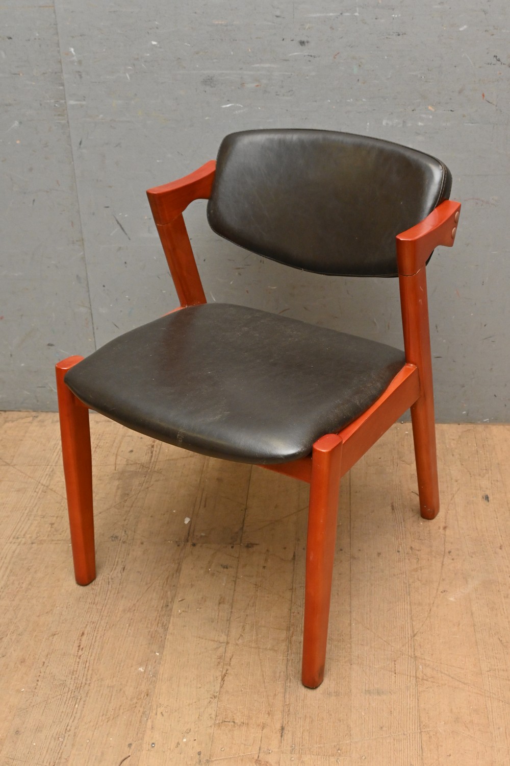 A MID-CENTURY STYLE TEAK & LEATHER CHAIR (A/F) ( 75H X 53W X 63D CM) (LEONARD JOEL DELIVERY SIZE: LARGE)