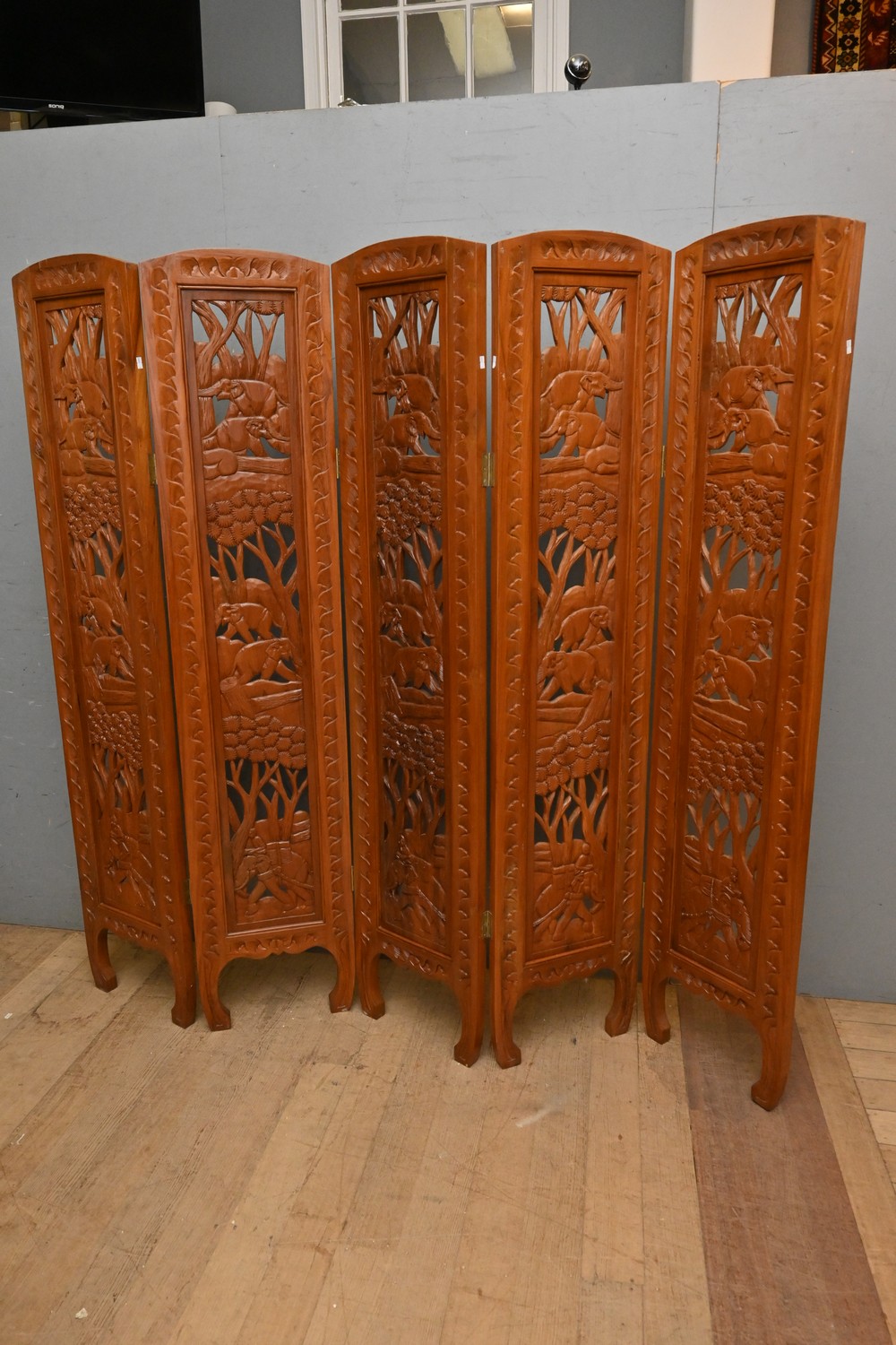 AN ORNATELY CARVED FIVE PANEL PRIVACY SCREEN (176H X 38W CM PER PANEL) (LEONARD JOEL DELIVERY SIZE: X-LARGE)