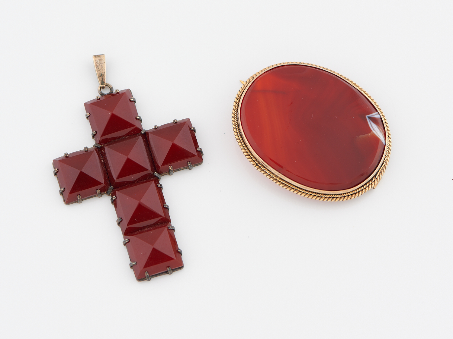 A CARNELIAN SET BROOCH AND CROSS PENDANT, THE OVAL BROOCH MEASURING 46 X 38MM AND THE CROSS MEASURING 52 X 38MM