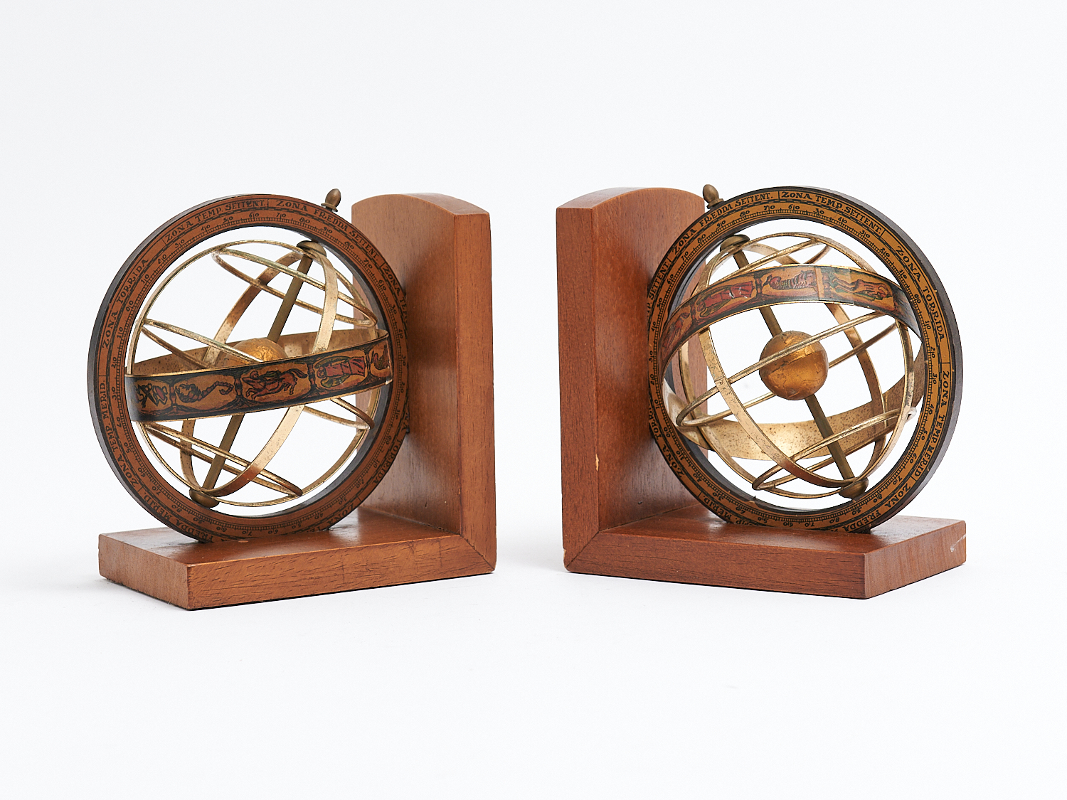 A PAIR OF VINTAGE ITALIAN MADE WOOD AND METAL ZODIAC WORLD GLOBE BOOK ENDS, H.15.5CM X W.14.5CM, LEONARD JOEL LOCAL DELIVERY: SMALL