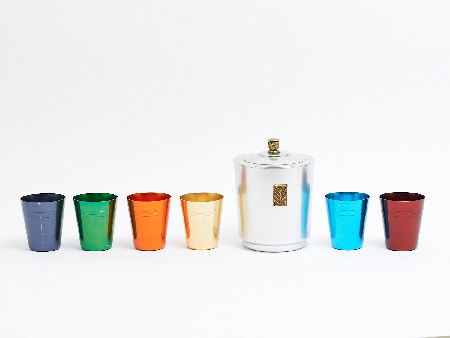 A SEVEN PIECE ANODISED TUMBLER AND ICE BUCKET SET, H.17CM (TALLEST), LEONARD JOEL LOCAL DELIVERY: SMALL