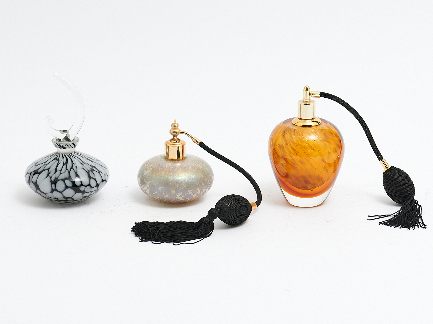A GROUP OF GLASS PERFUME BOTTLES AND ATOMISERS (A/F) H.16CM (TALLEST), LEONARD JOEL LOCAL DELIVERY: SMALL