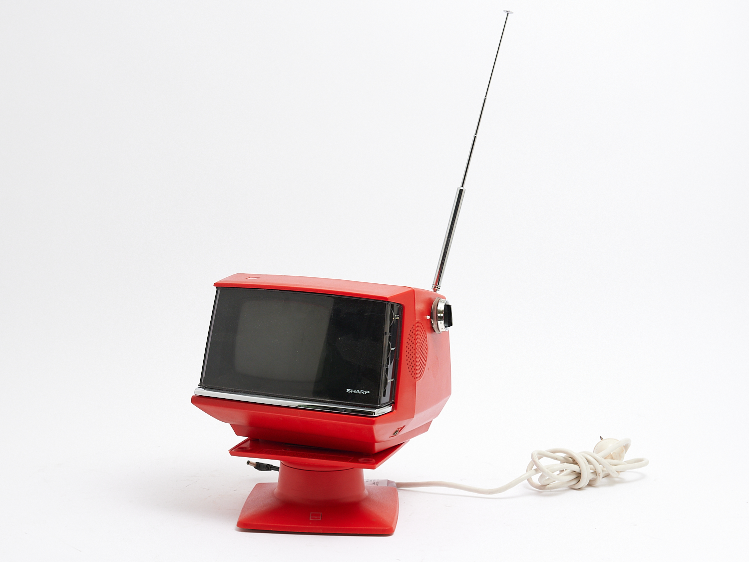 A 1970S SHARP RED TELEVISION ON SWIVEL STAND, H.26CM (A/F), LEONARD JOEL LOCAL DELIVERY: MEDIUM