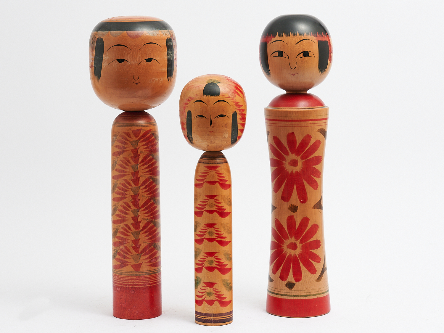 THREE JAPANESE HAND PAINTED WOODEN KOKESHI DOLLS, H.46CM (TALLEST), LEONARD JOEL LOCAL DELIVERY: MEDIUM