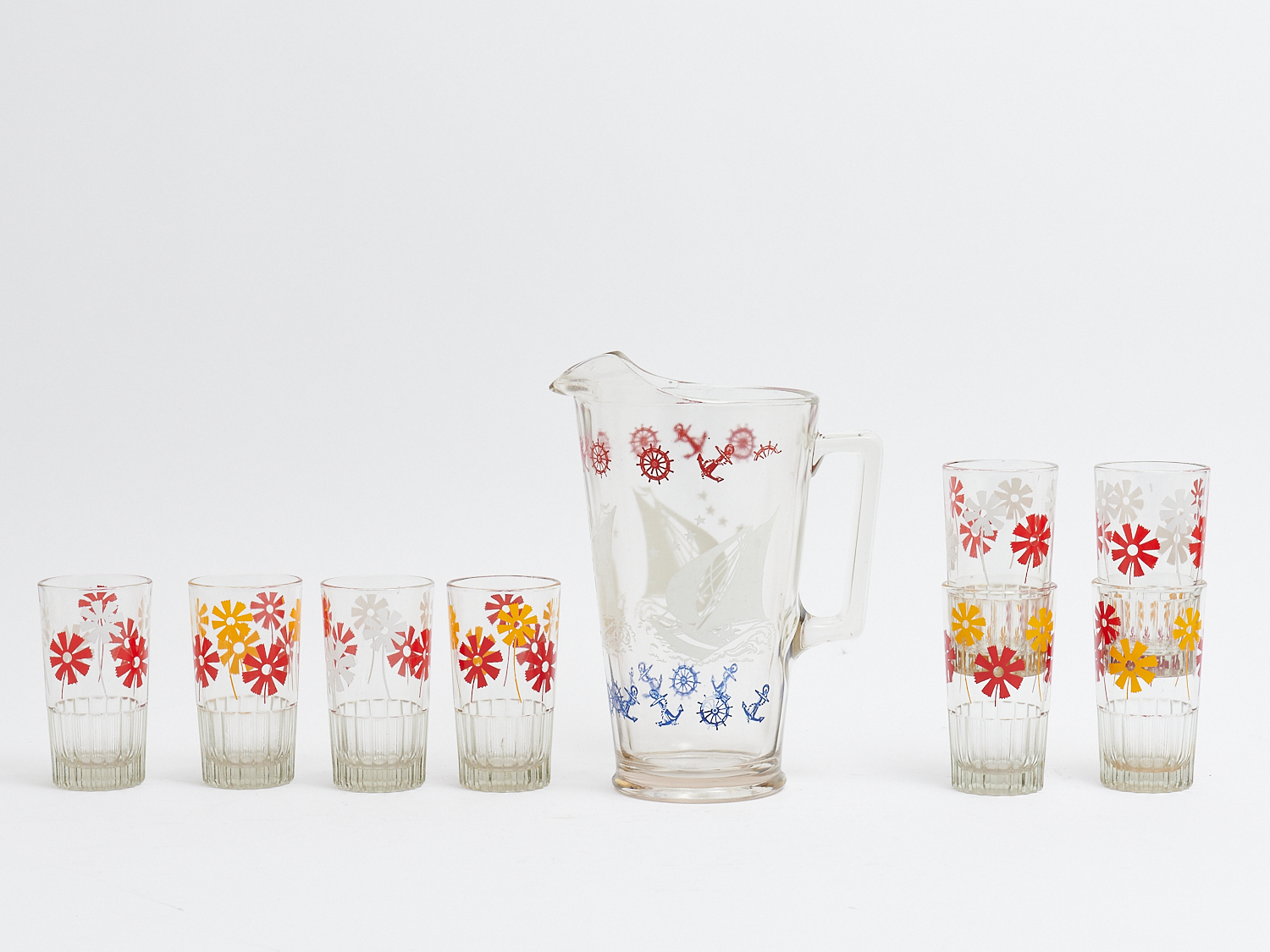 A NINE PIECE LEMONADE SET WITH ENAMELLED SHIP AND FLOWER DETAILS H.25CM (LARGEST), LEONARD JOEL LOCAL DELIVERY: MEDIUM