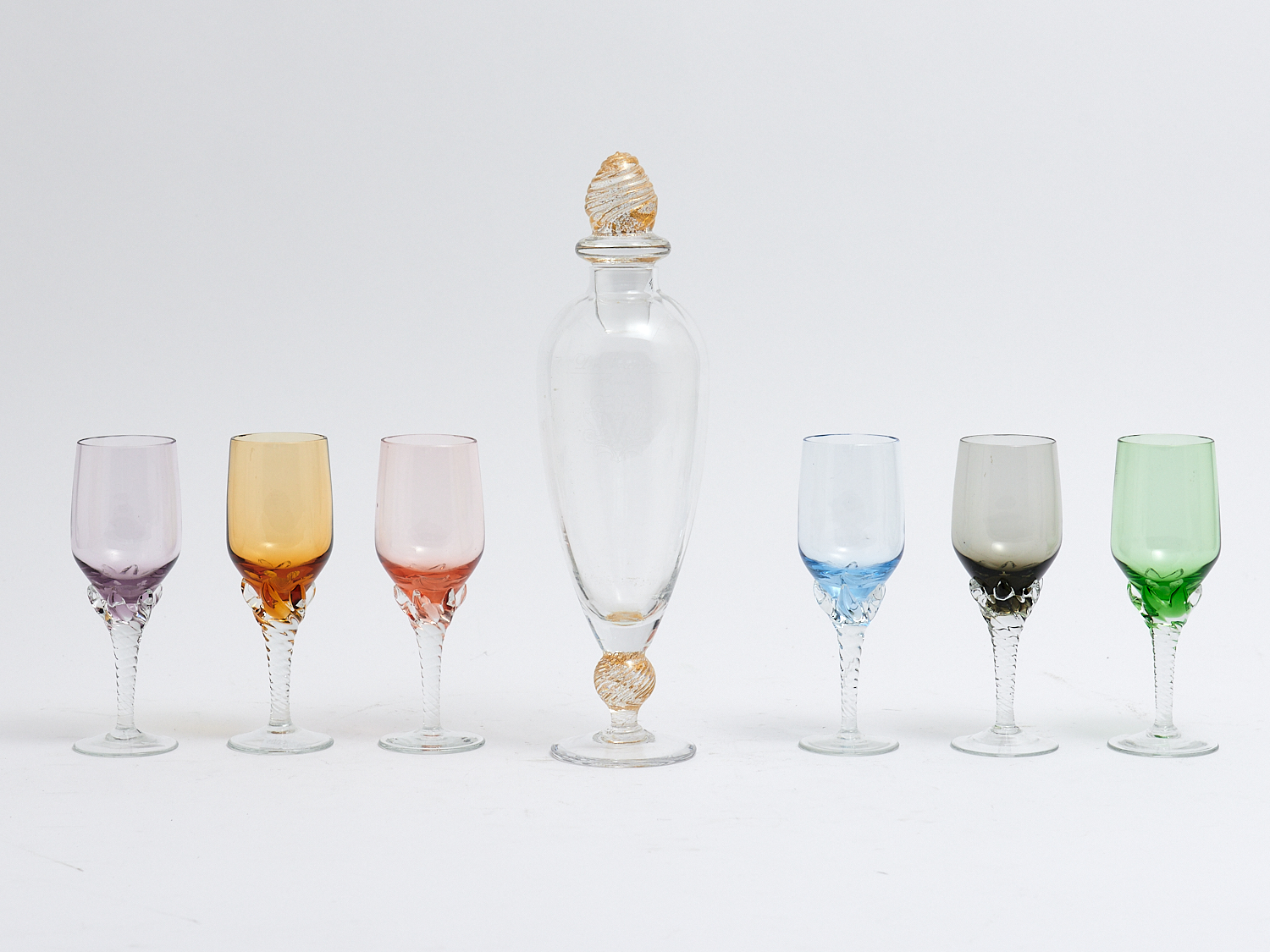 A SEVEN PIECE HARLEQUIN DRINKS SET INCLUDING DECANTER AND SIX GLASSES, LEONARD JOEL LOCAL DELIVERY: MEDIUM