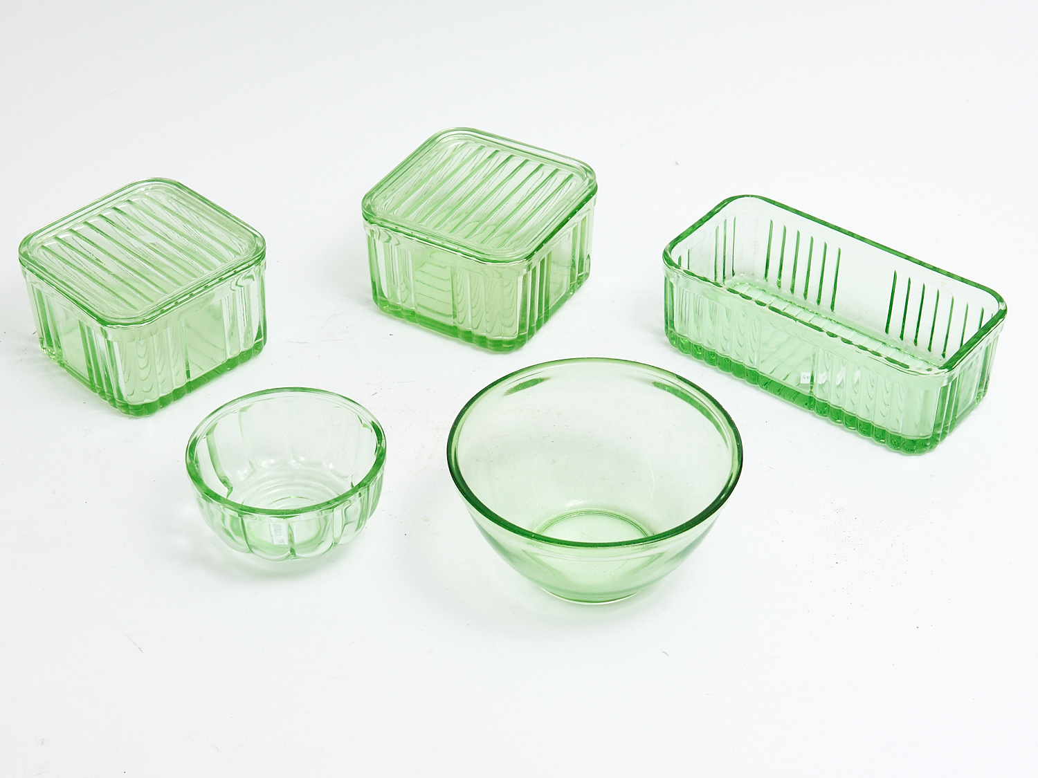 A COLLECTION OF FIVE VINTAGE GREEN DEPRESSION GLASS LIDDED CONTAINERS AND BOWLS, LEONARD JOEL LOCAL DELIVERY: MEDIUM