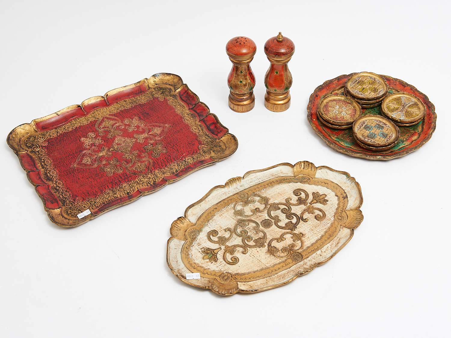 A COLLECTION OF ITALIAN FLORENTINE TRAYS, COASTERS, SALT AND PEPPER GRINDERS W.52.5CM (LARGEST), LEONARD JOEL LOCAL DELIVERY: MEDIUM