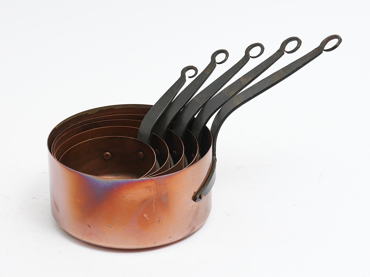 A GRADUATED SET OF COPPER SAUCEPANS DIA.20CM (LARGEST), LEONARD JOEL LOCAL DELIVERY: MEDIUM