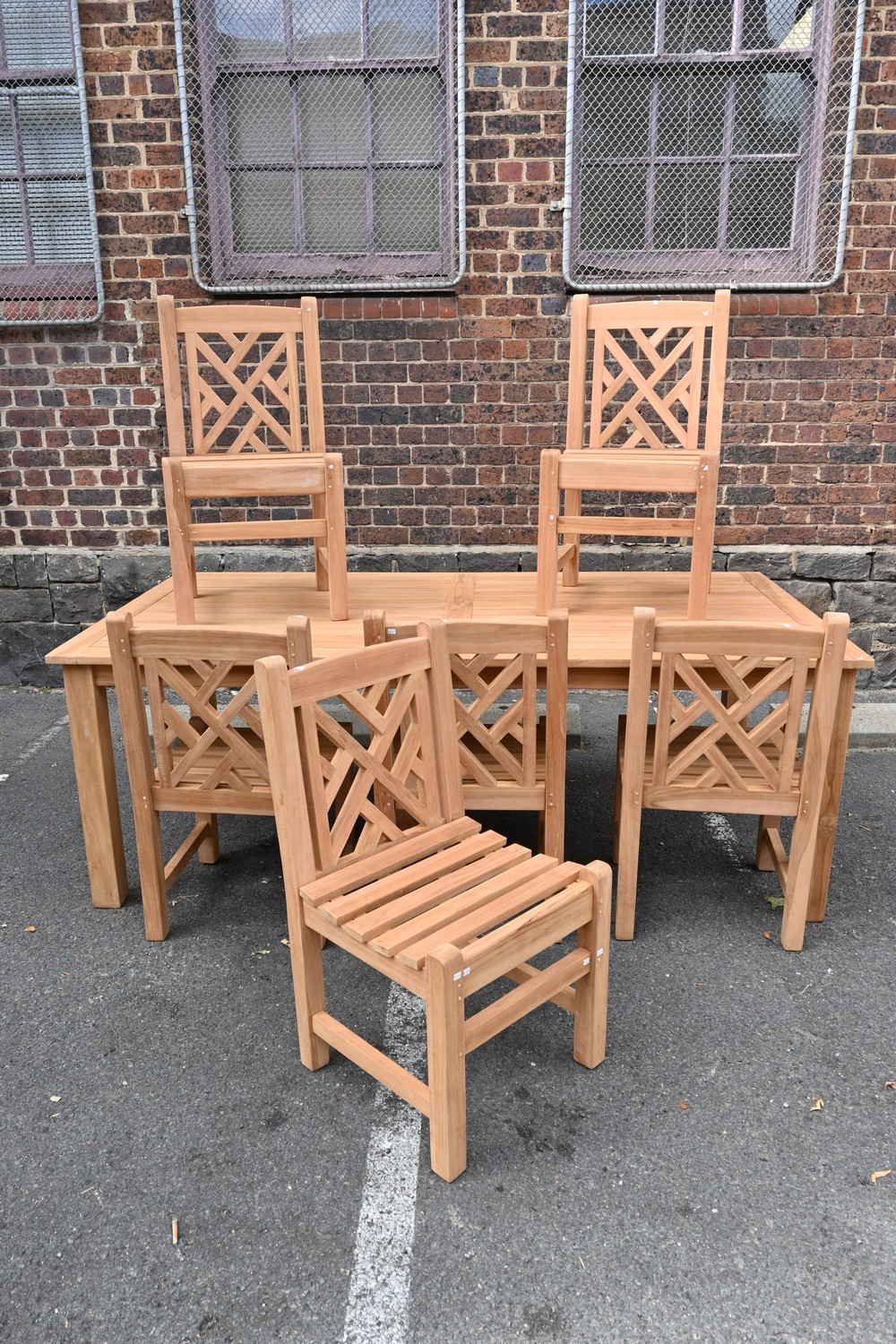 A SEVEN PIECE TEAK OUTDOOR DINING SETTING (H77 X W216 X D110 CM) (PLEASE NOTE THIS HEAVY ITEM MUST BE REMOVED BY CARRIERS AT THE CUSTOMER'S EXPENSE. LEONARD JOEL STAFF CANNOT ASSIST CARRYING THIS ITEM) (X-LARGE ITEM)