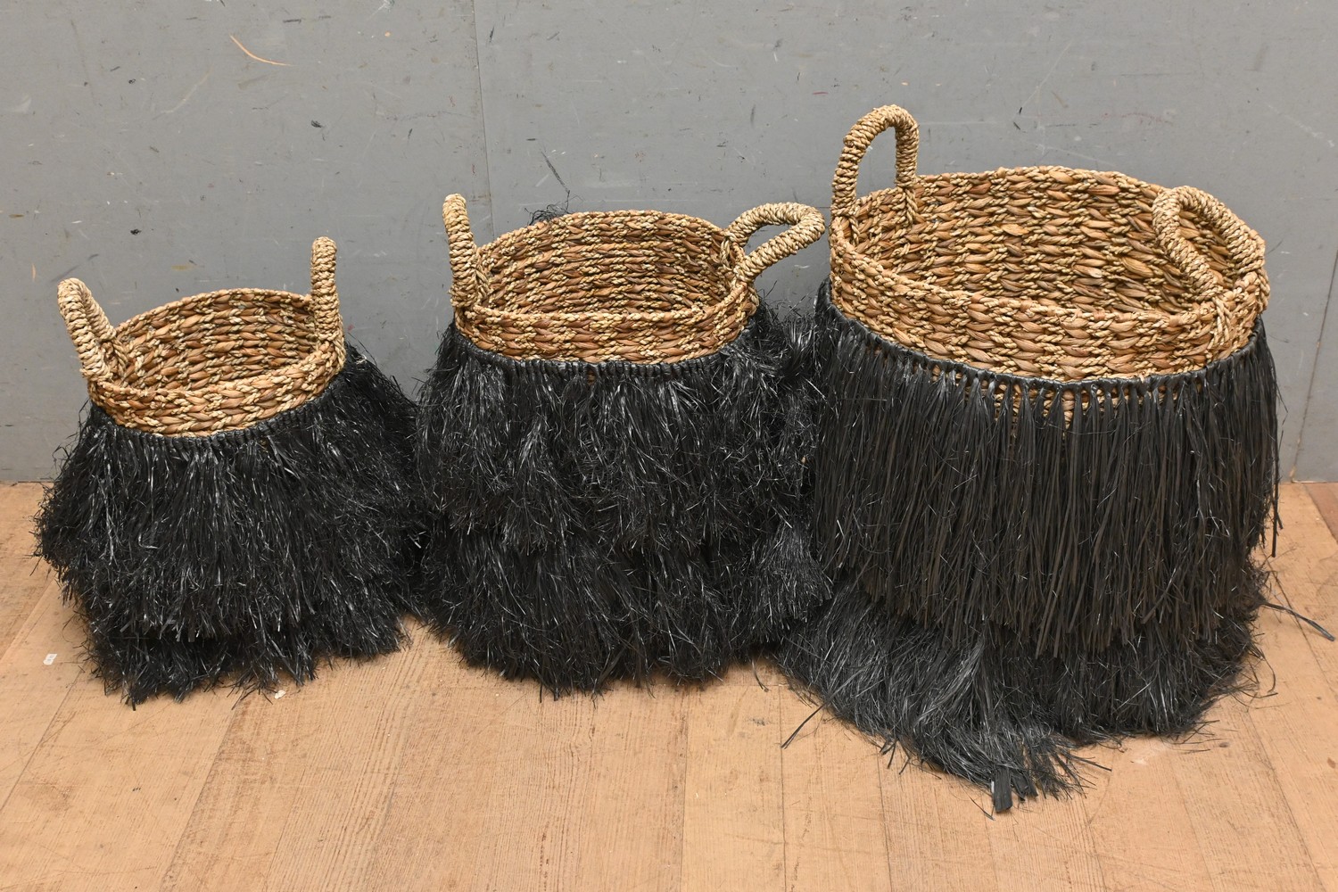 THREE WATER HYACINTH AND BLACK RAFFIA BASKETS (53H X 50D CM) (LEONARD JOEL DELIVERY SIZE: LARGE)