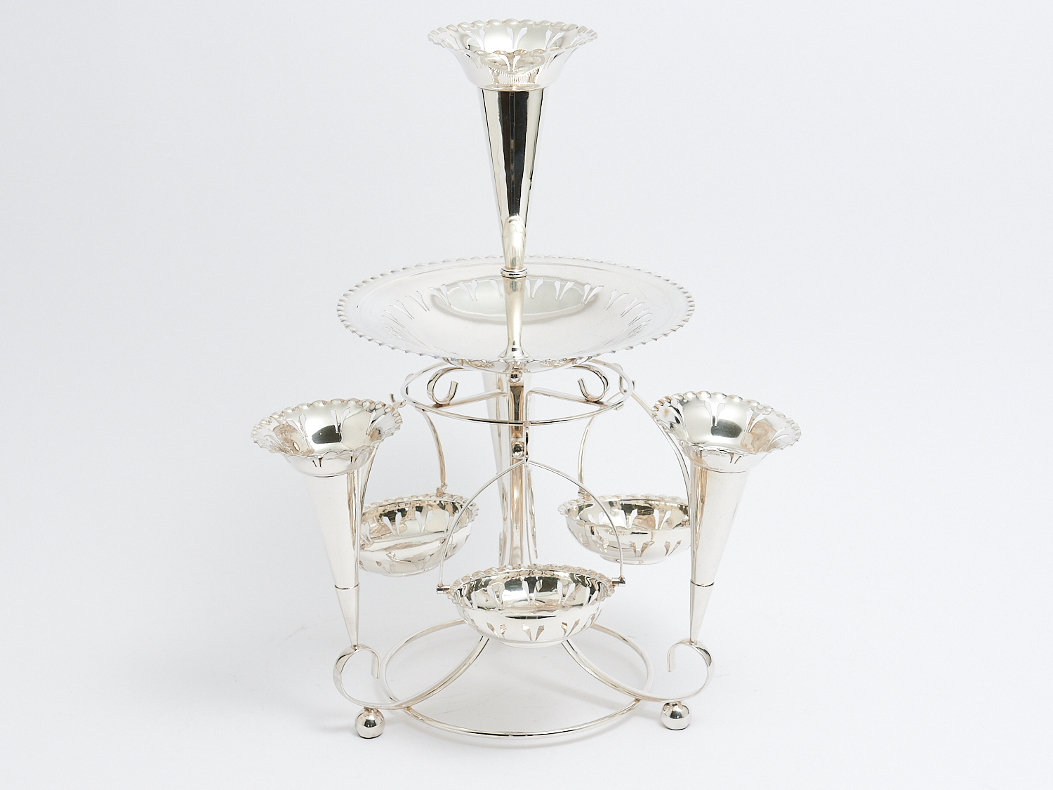 A SILVERPLATED CENTREPIECE EPERGNE WITH HANGING BASKETS H.41CM, LEONARD JOEL LOCAL DELIVERY: MEDIUM
