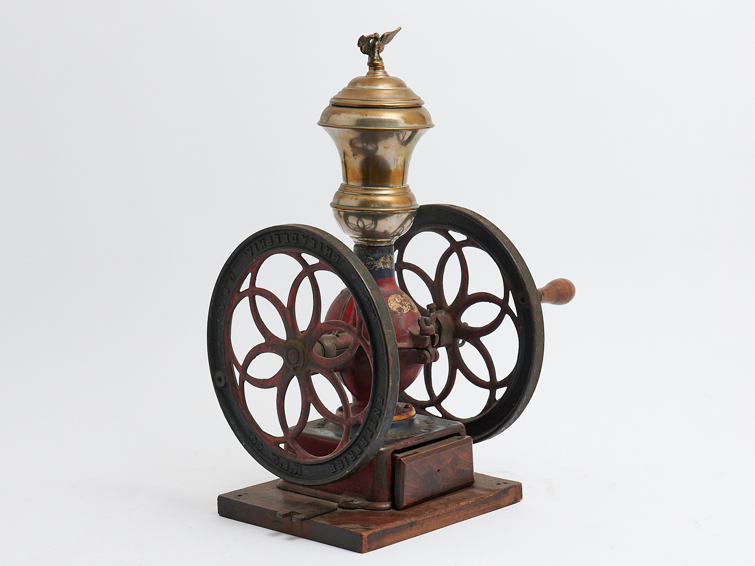 A 19TH C. AMERICAN CAST IRON PAINTED 'ENTERPRISE MFG CO' DOUBLE WHEEL COFFEE GRINDER H.54CM, LEONARD JOEL LOCAL DELIVERY: MEDIUM