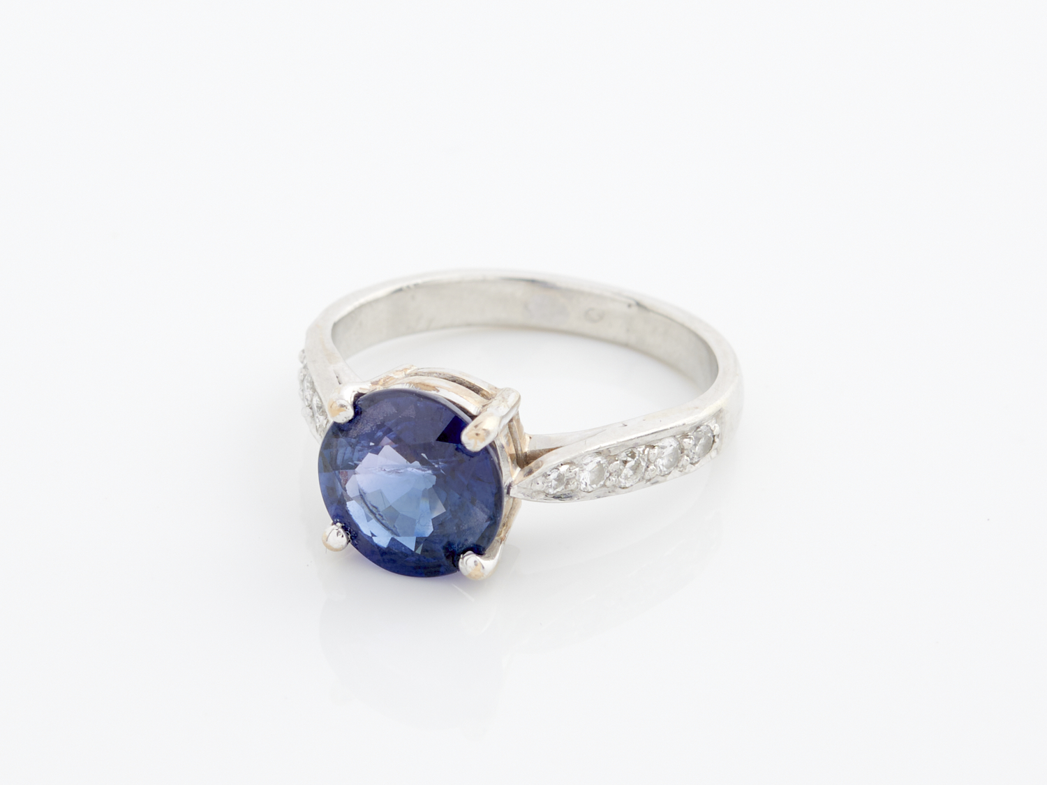 A COMPOSITE GEM AND DIAMOND RING IN PLATINUM, THE DIAMONDS TOTALLING APPROXIMATELY 0.21CTS, SIZE K, 4.90GMS