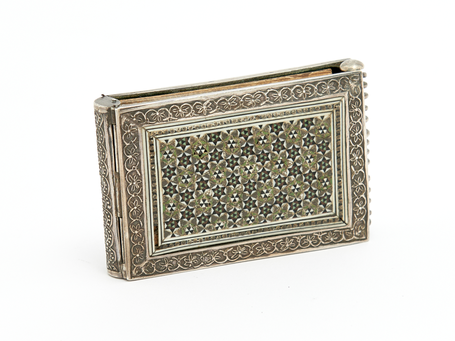 AN AIDE-MEMOIRE IN SILVER MICRO INLAID CASE H.8 X W.5 X D.1CM, LEONARD JOEL LOCAL DELIVERY: SMALL