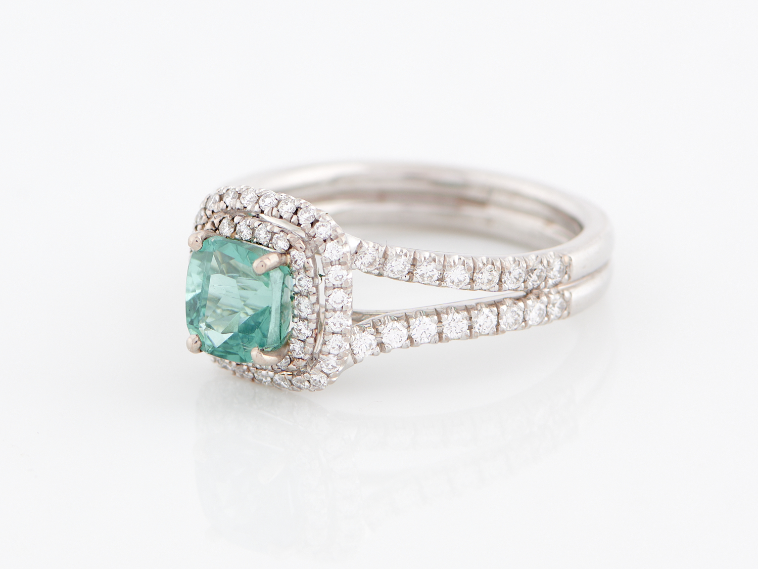 A PARAIBA TOURMALINE AND DIAMOND RING IN 18CT WHITE GOLD, RING SIZE M