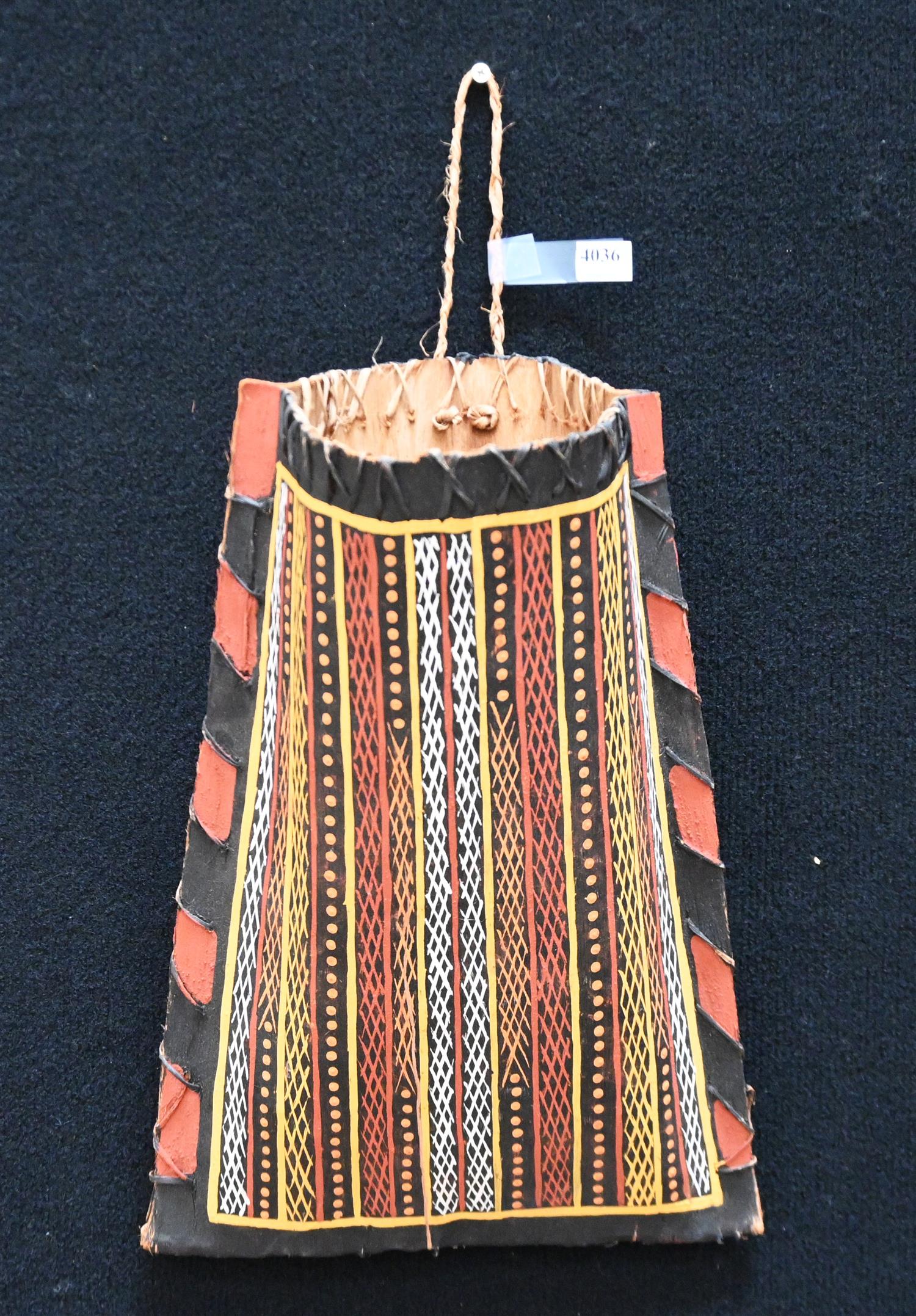 In stable condition. Light wear to the pigment and inherent splits to the bark. The hanging string is sufficiently worn and close to breaking.