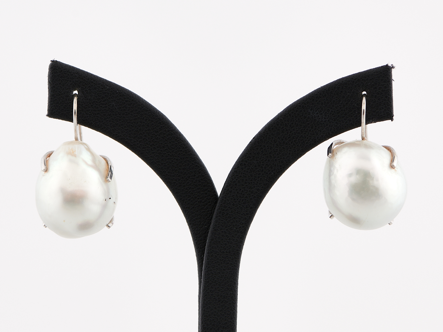 A PAIR OF BAROQUE SOUTH SEA PEARL EARRINGS IN 18CT WHITE GOLD, THE PEARLS MEASURING APPROXIMATELY 21 X 17.8MM, TO SHEPHERD HOOK FITTINGS