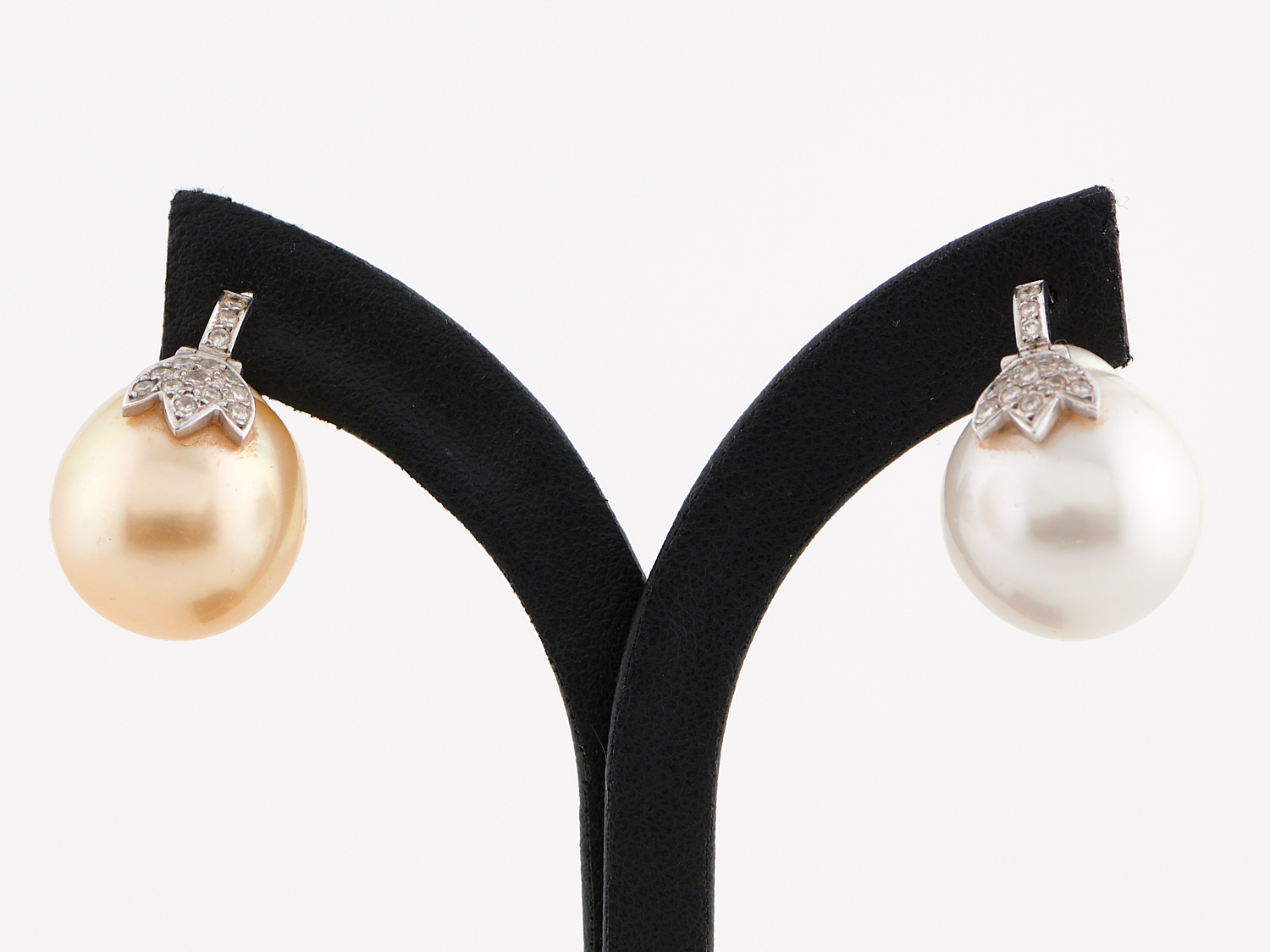A PAIR OF 16.8MM SOUTH SEA PEARL, GOLDEN SOUTH SEA PEARL AND DIAMOND EARRINGS IN 18CT WHITE GOLD, TO SHEPERD HOOK FITTINGS, LENGTH 25MM