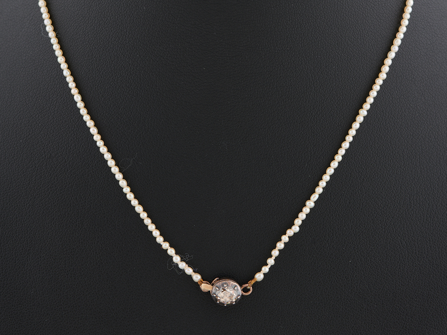 A STRAND OF NATURAL PEARLS TO ROSE-CUT DIAMOND SET CLASP, LENGTH 380MM