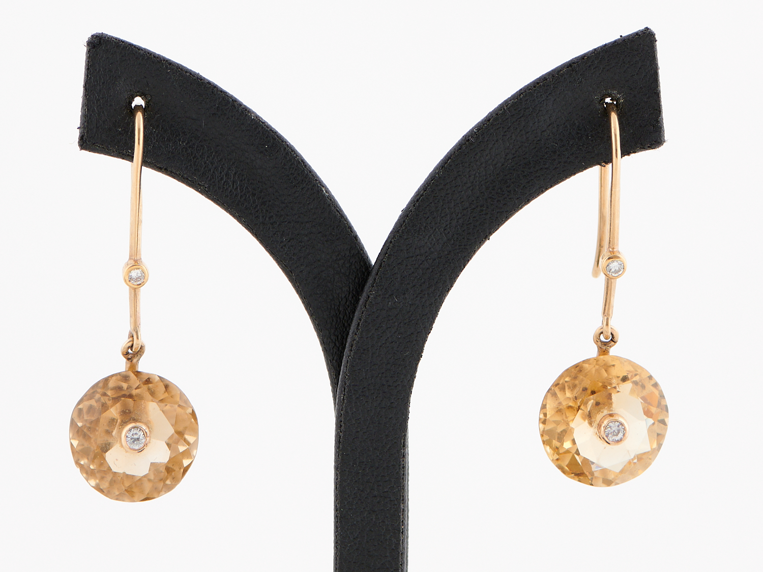 A PAIR OF CITRINE AND DIAMOND EARRINGS IN 9CT GOLD, TO SHEPHERD HOOK FITTINGS, LENGTH 40MM