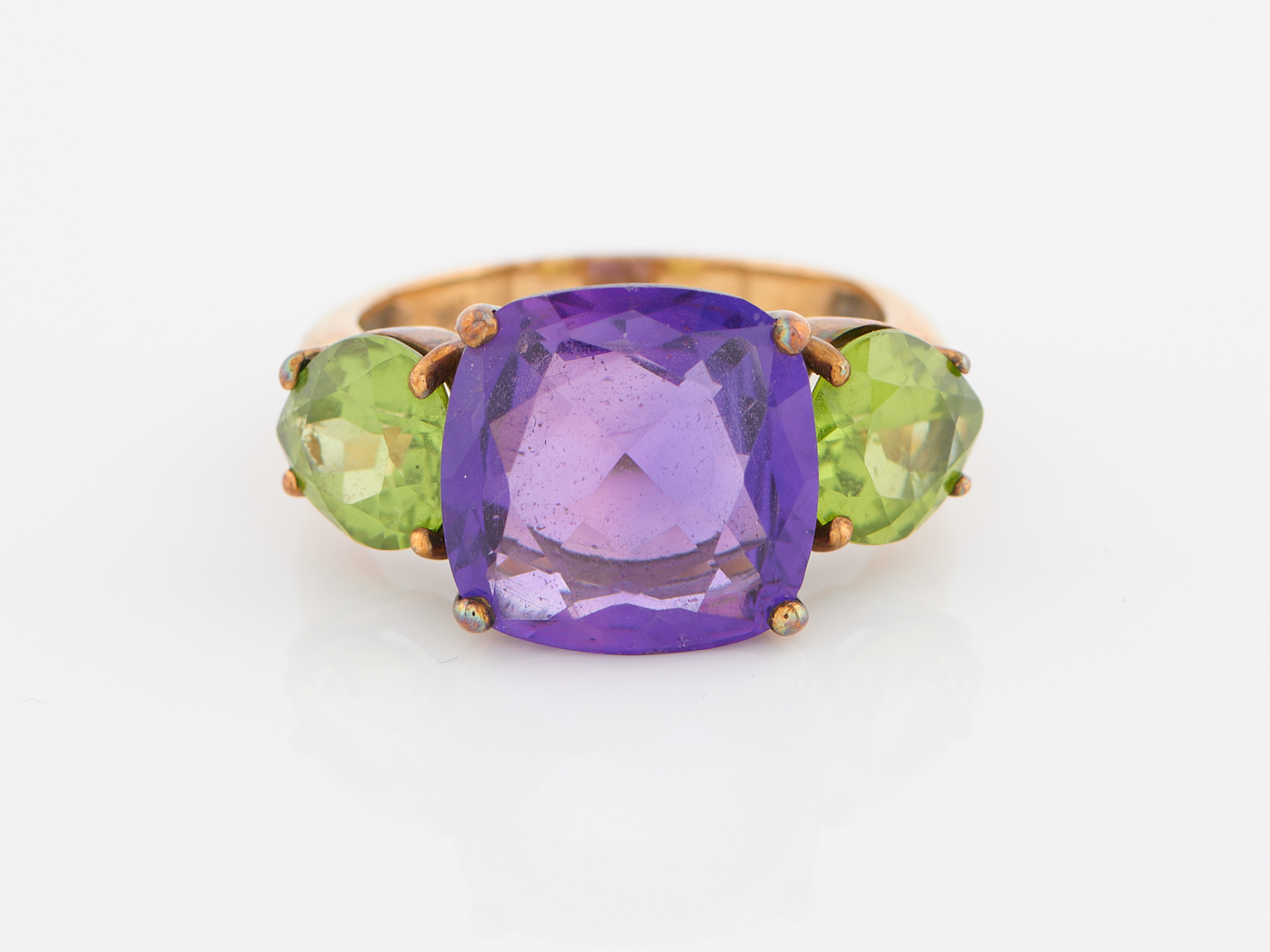 AN AMETHYST AND PERIDOT RING IN 9CT GOLD, RING SIZE N/O, 6.1GMS
