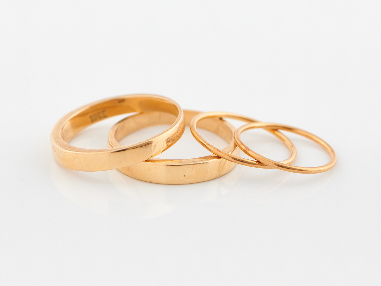 FOUR WEDDERS IN 18CT GOLD, RING SIZES Q, R, H AND J, 10GMS