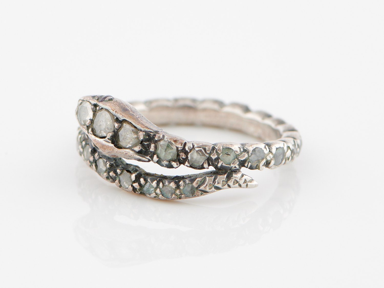 A GEORGIAN DIAMOND SNAKE RING IN SILVER, SIZE N