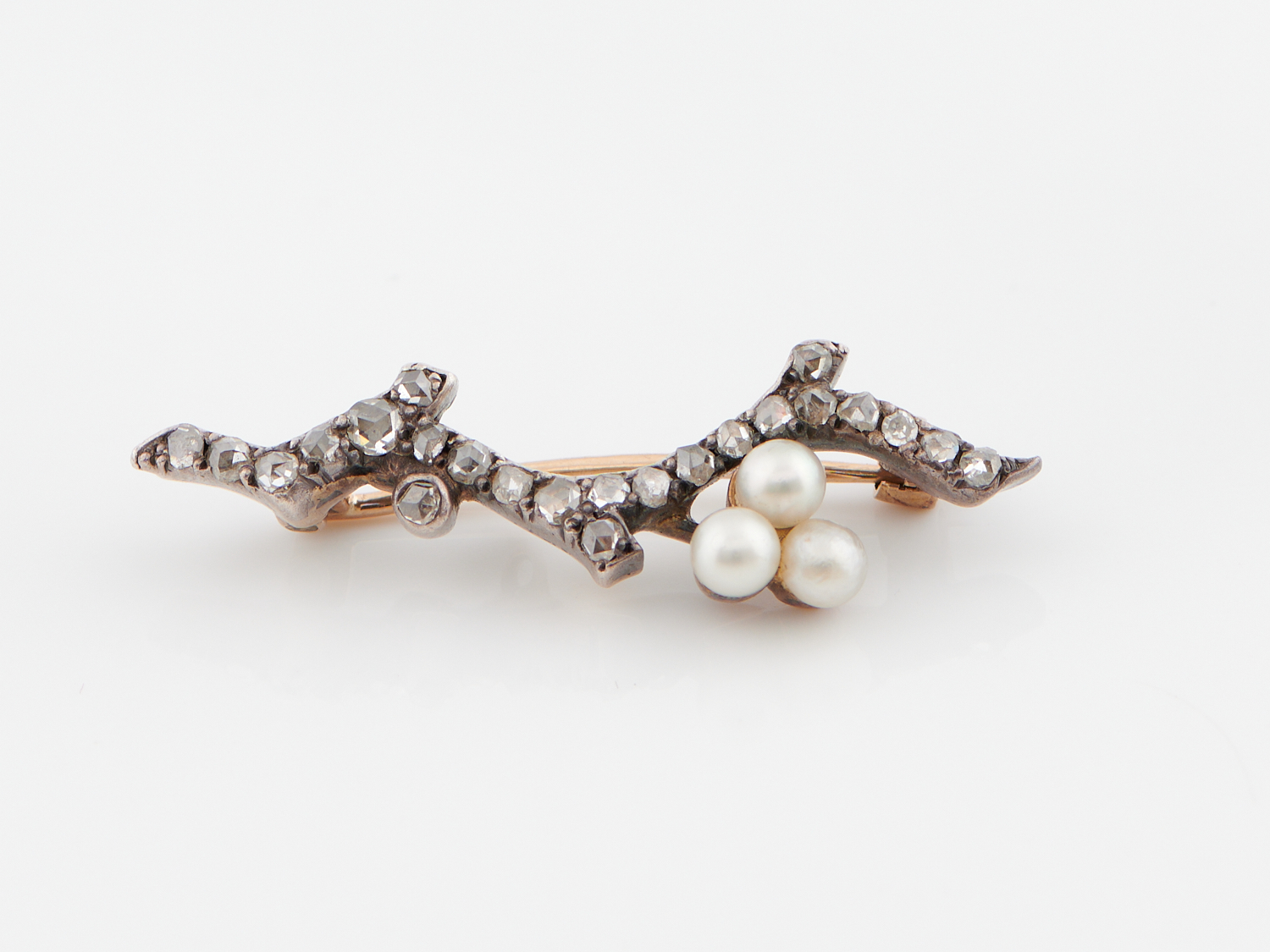 A VICTORIAN PEARL AND DIAMOND BROOCH IN SILVER AND GOLD, LENGTH 35MM
