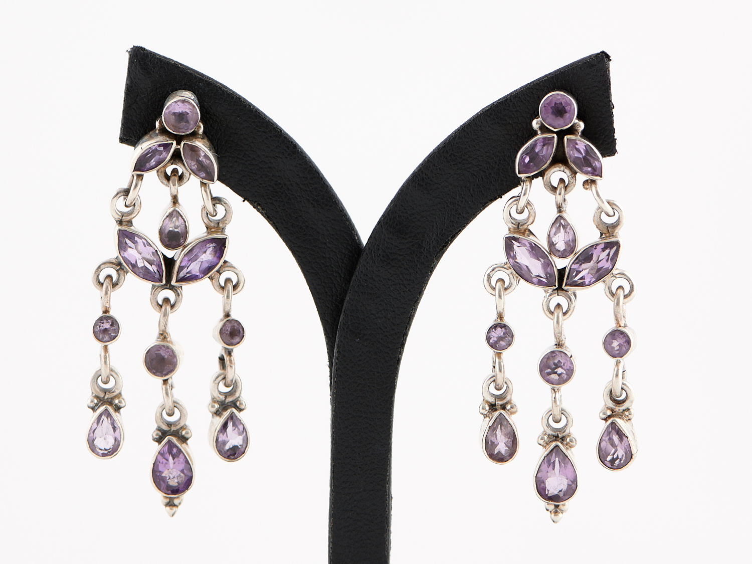A PAIR OF VINTAGE AMETHYST SET DROP EARRINGS IN SILVER, DROP LENGTH 50MM, TO POST AND BUTTERFLY FITTINGS