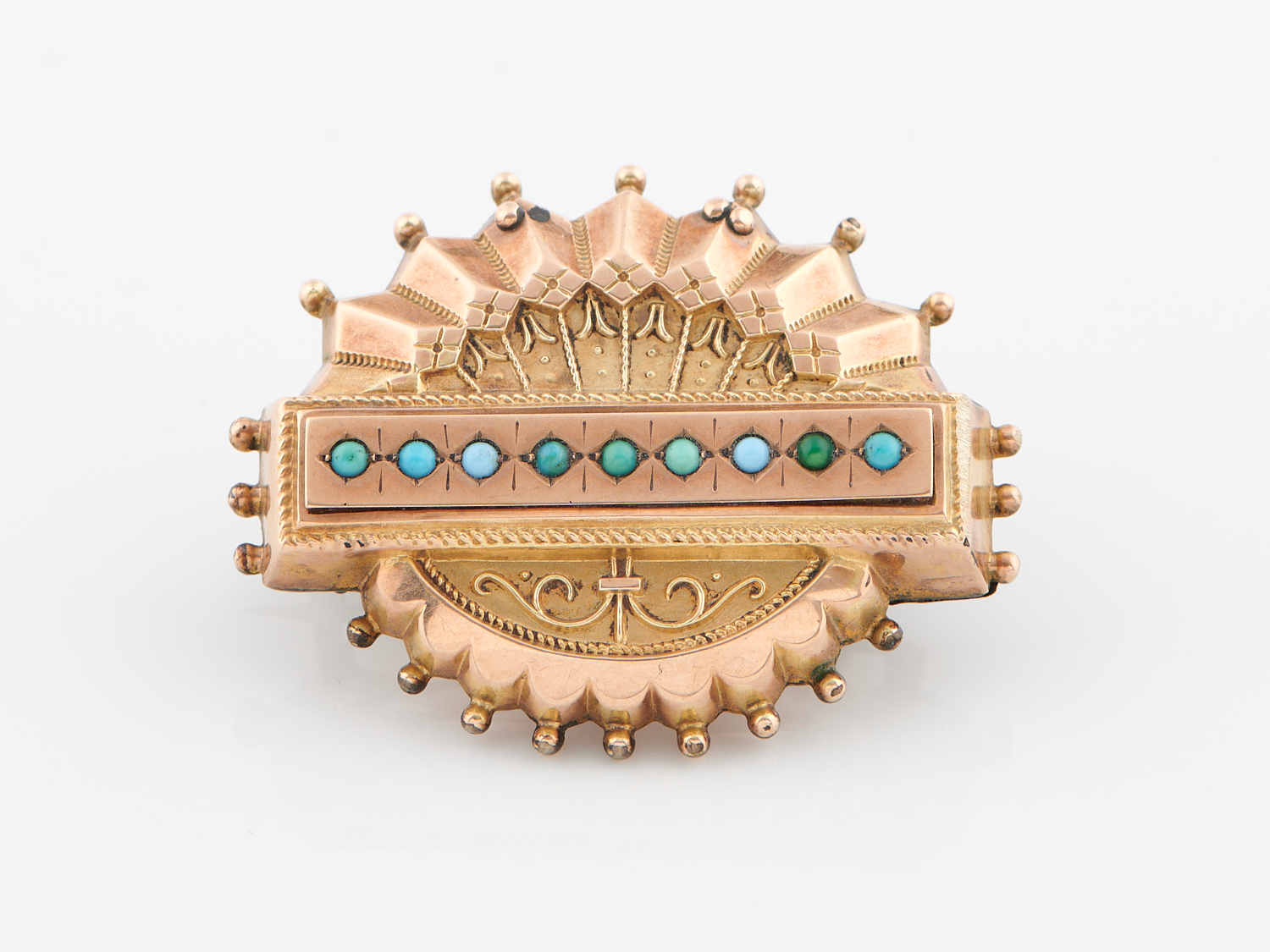 A VICTORIAN BROOCH/LOCKET WITH CASE IN 9CT GOLD, SET WITH TURQUOISE, 8.5 GMS