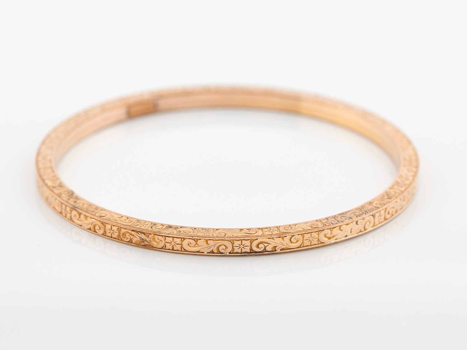 A VINTAGE ENGRAVED BANGLE IN ROLLED GOLD, DIAMETER 75MM