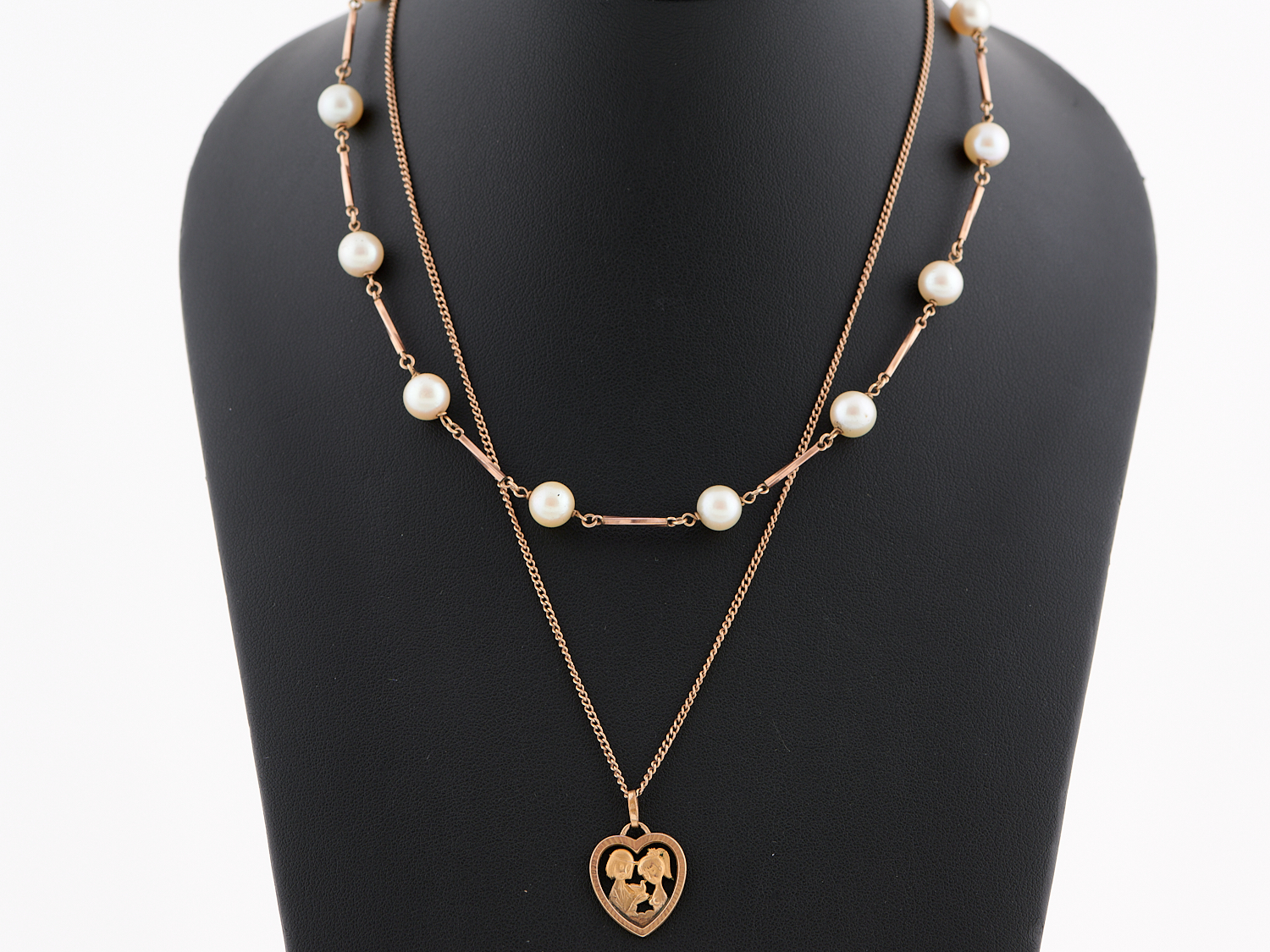 A CULTURED PEARL NECKALCE IN 9CT GOLD, TOGETHER WITH A 9CT GOLD CHARM TO A GOLD PLATED CHAIN