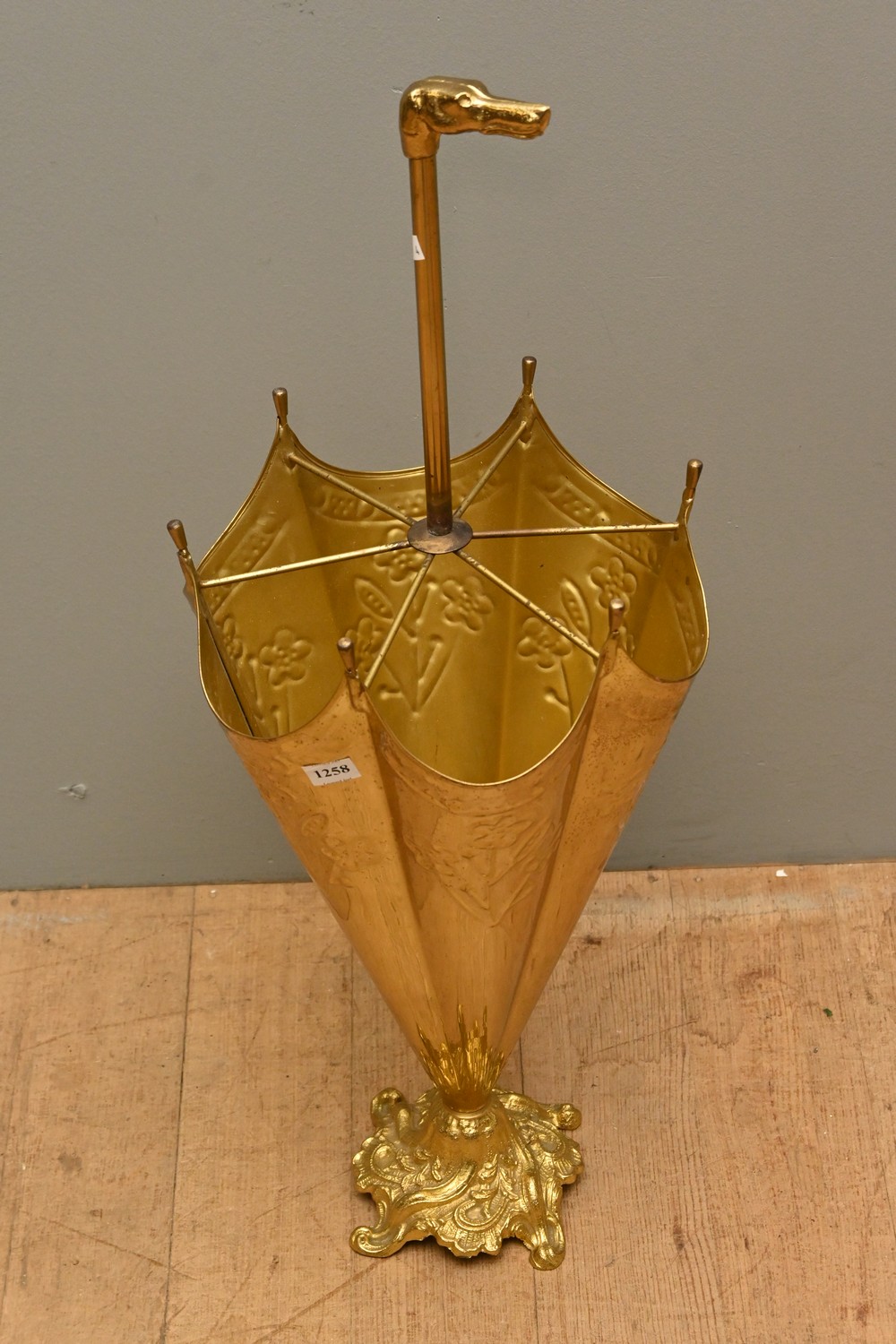 A VINTAGE BRASS, DOG HEAD HANDLE UMBRELLA FORM UMBRELLA STAND (A/F) (74H CM) (LEONARD JOEL DELIVERY SIZE: LARGE)
