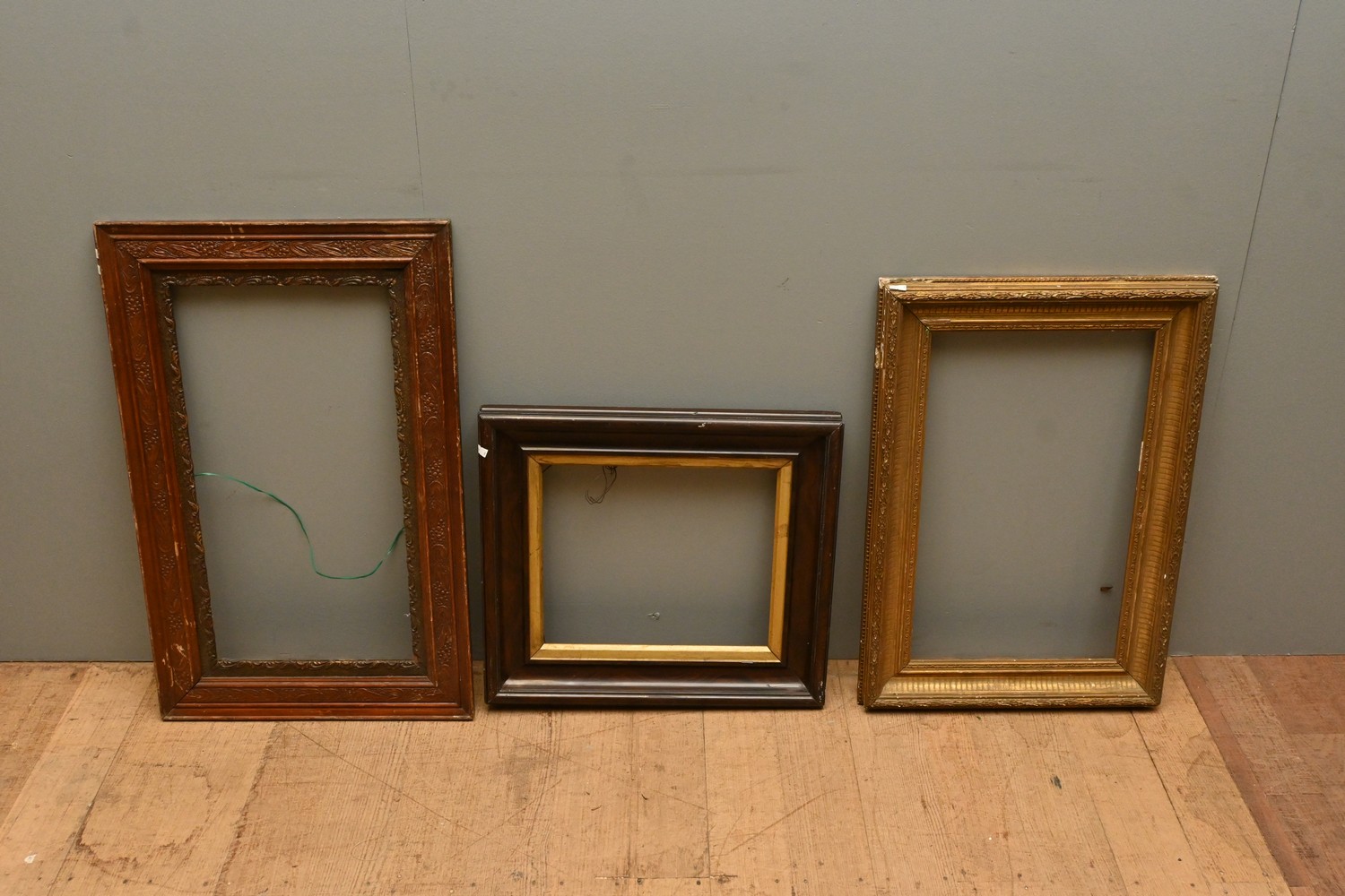 A GROUP OF THREE CARVED TIMBER PICTURE FRAMES ONE WITH GILT EFFECT (A/F) (75H X 47W CM) (LEONARD JOEL DELIVERY SIZE: MEDIUM)